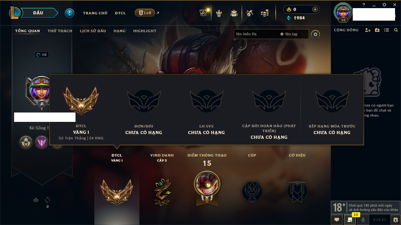 Rank Đơn: Chưa rank mùa nàoKhung: Chưa có khungTướng: 15 - Còn 3080 THXTrang Phục: 2Rank ĐTCL: Chưa RankLinh Thú: 40