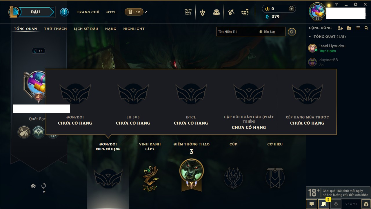 Rank Đơn: Chưa rank mùa nàoKhung: Chưa có khungTướng: 16 - Còn 4325 THXTrang Phục: 2Rank ĐTCL: Chưa RankLinh Thú: 11