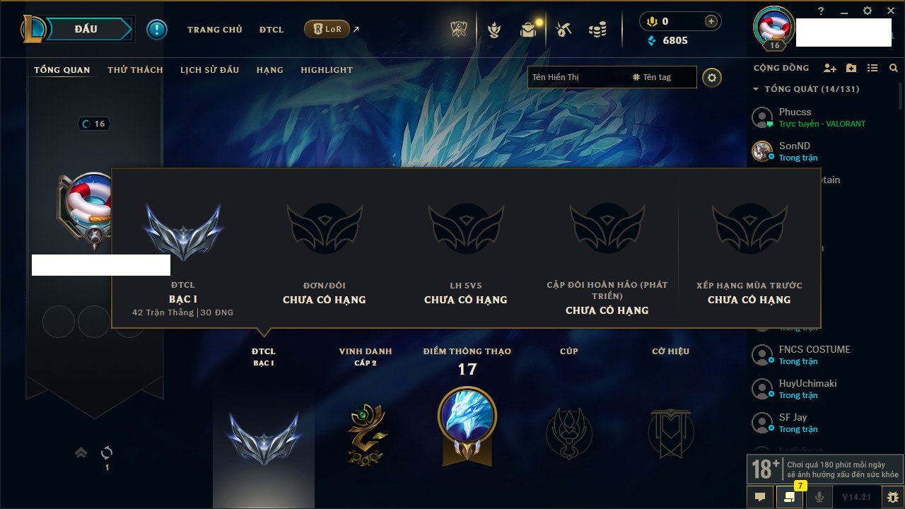 Rank Đơn: Chưa rank mùa nàoKhung: Chưa có khungTướng: 17 - Còn 6805 THXTrang Phục: 1Rank ĐTCL: Chưa RankLinh Thú: 4