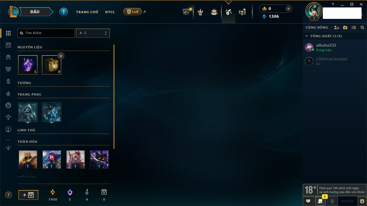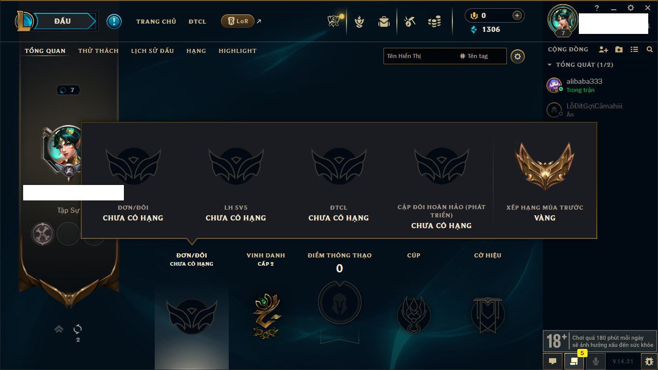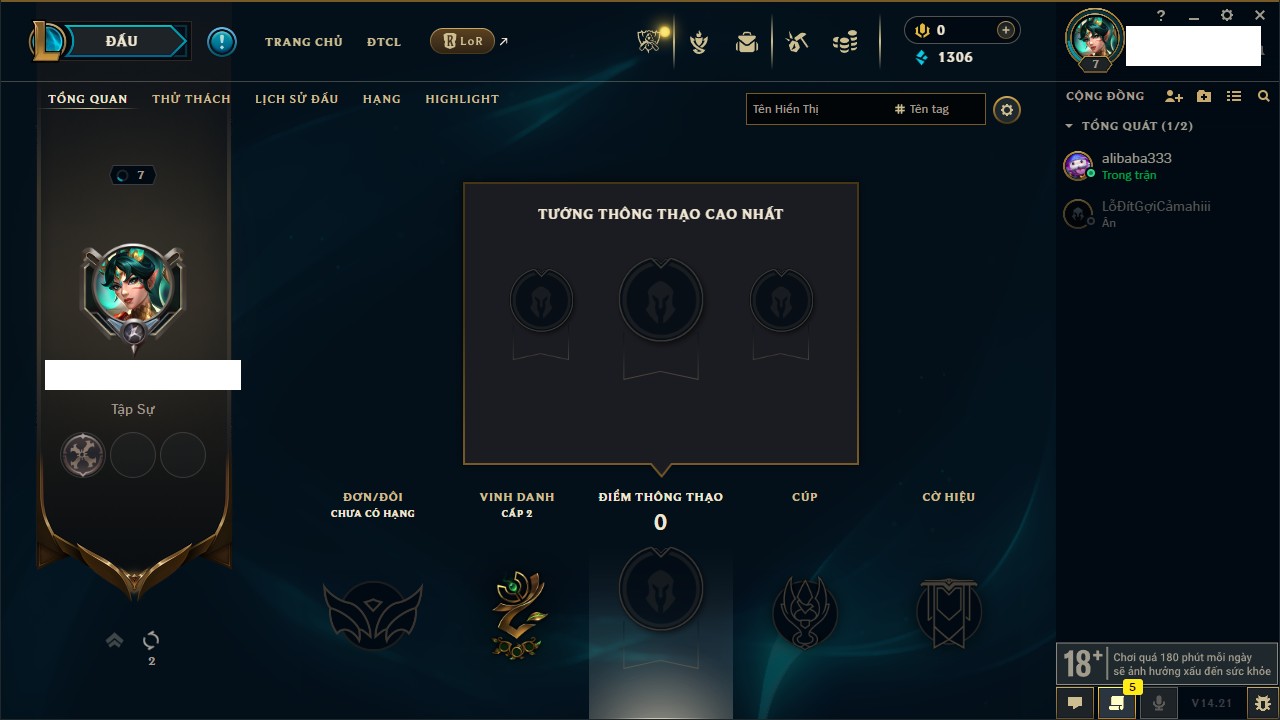 Rank Đơn: Chưa rank mùa nàoKhung: Chưa có khungTướng: 38 - Còn 6280 THXTrang Phục: 2Rank ĐTCL: Chưa RankLinh Thú: 50