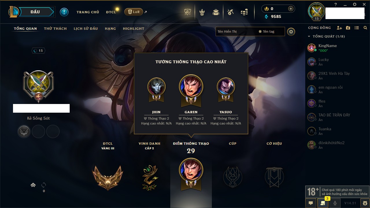 Rank Đơn: Chưa rank mùa nàoKhung: Chưa có khungTướng: 19 - Còn 1155 THXTrang Phục: 2Rank ĐTCL: Chưa RankLinh Thú: 20