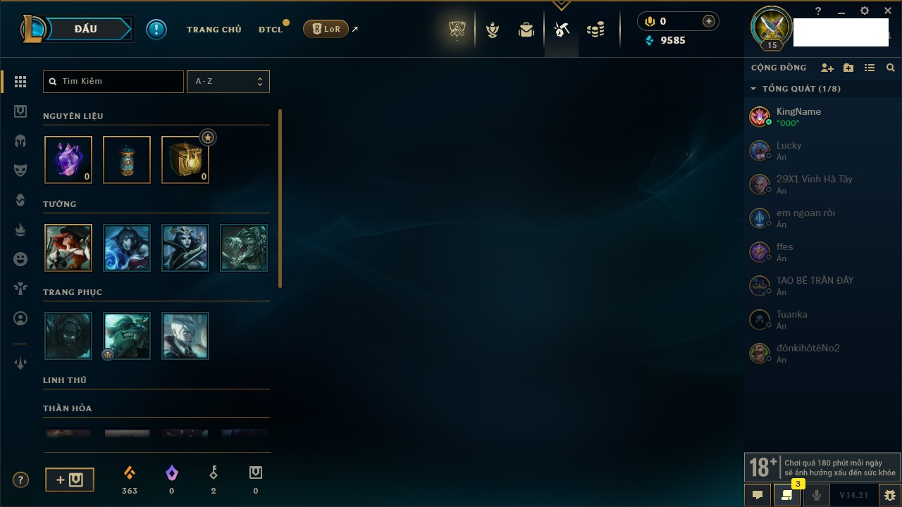 Rank Đơn: Chưa rank mùa nàoKhung: Chưa có khungTướng: 12 - Còn 10800 THXTrang Phục: 2Rank ĐTCL: Chưa RankLinh Thú: 16