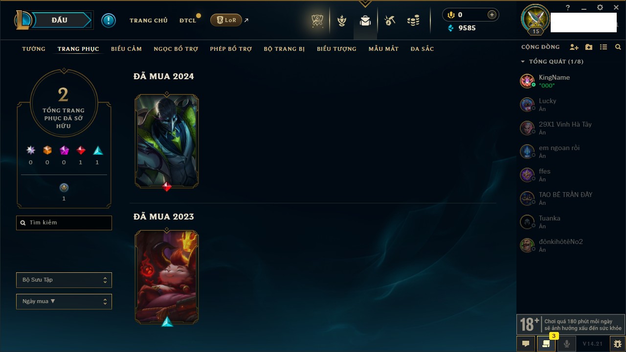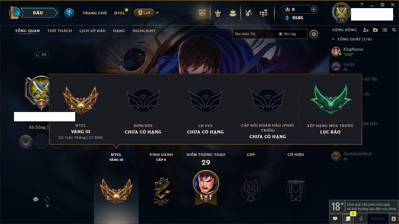 Rank Đơn: Chưa rank mùa nàoKhung: Chưa có khungTướng: 23 - Còn 2245 THXTrang Phục: 2Rank ĐTCL: Chưa RankLinh Thú: 28