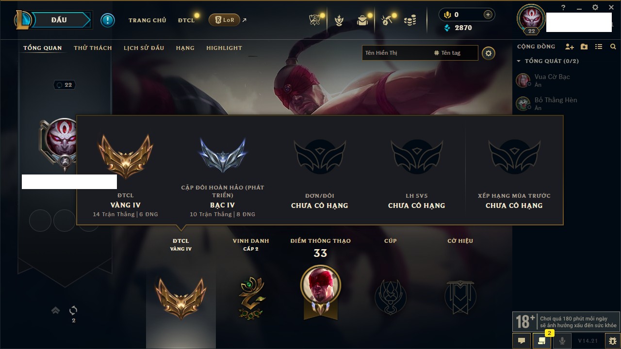 Rank Đơn: Chưa rank mùa nàoKhung: Chưa có khungTướng: 15 - Còn 3080 THXTrang Phục: 2Rank ĐTCL: Chưa RankLinh Thú: 40