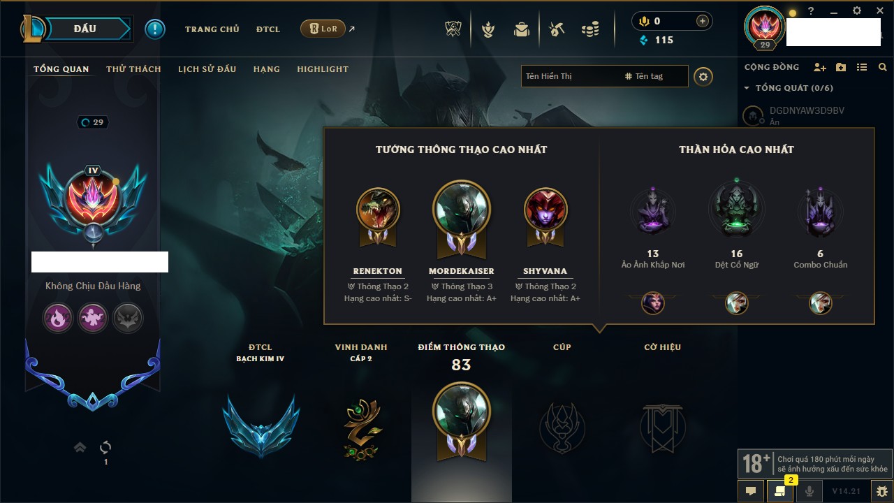 Rank Đơn: Chưa rank mùa nàoKhung: Chưa có khungTướng: 38 - Còn 6280 THXTrang Phục: 2Rank ĐTCL: Chưa RankLinh Thú: 50