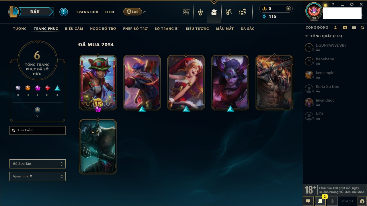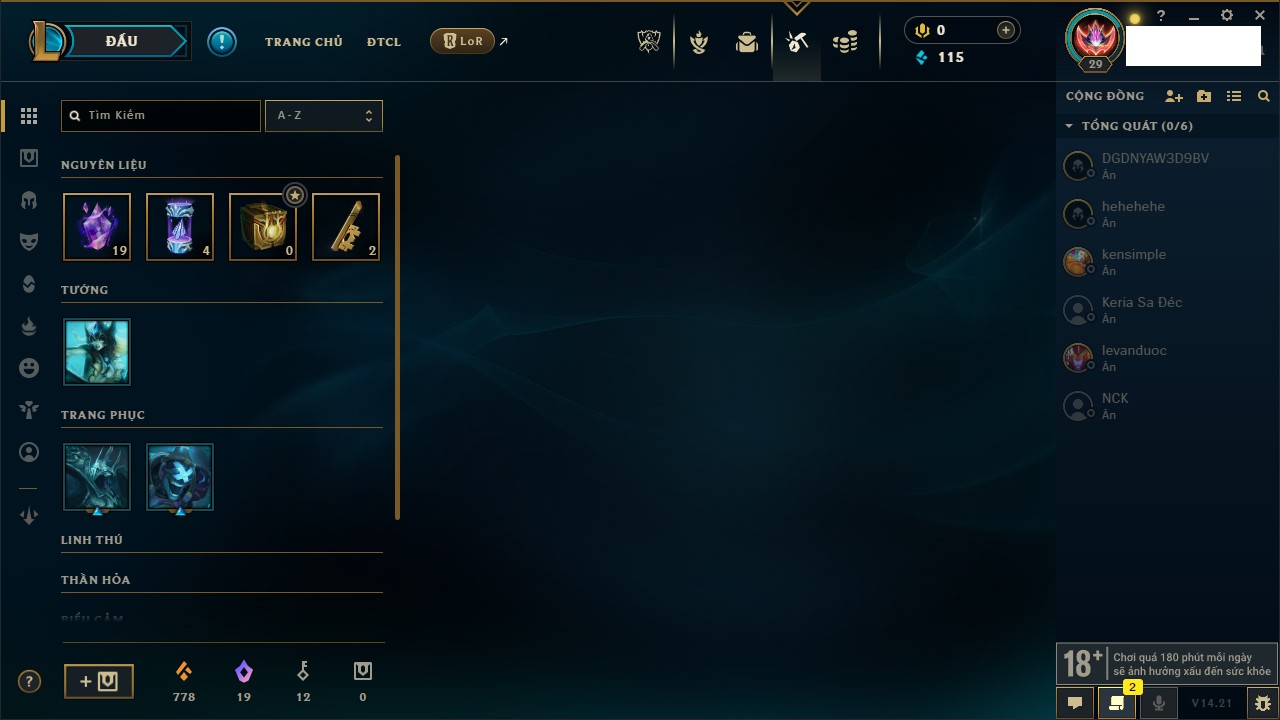 Rank Đơn: Chưa rank mùa nàoKhung: Chưa có khungTướng: 62 - Còn 2196 THXTrang Phục: 17Rank ĐTCL: Chưa RankLinh Thú: 88