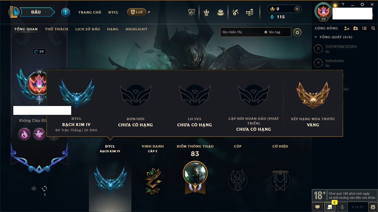 Rank Đơn: Chưa RankKhung: Chưa có khungTướng: 29 - Còn 54 THXTrang Phục: 0Rank ĐTCL: Chưa RankLinh Thú: 1