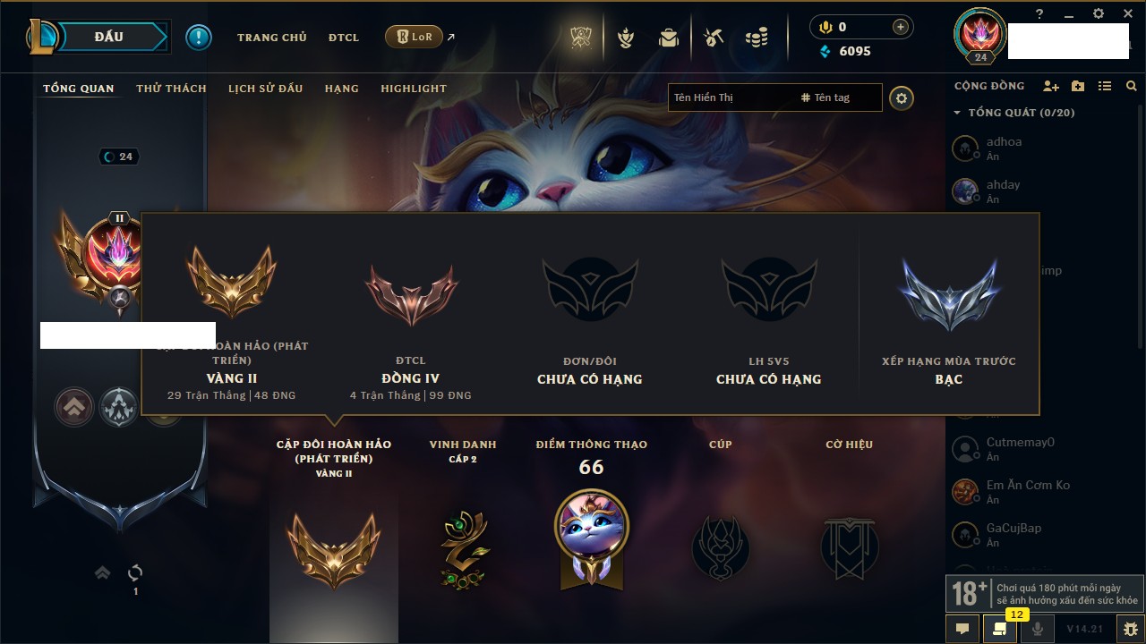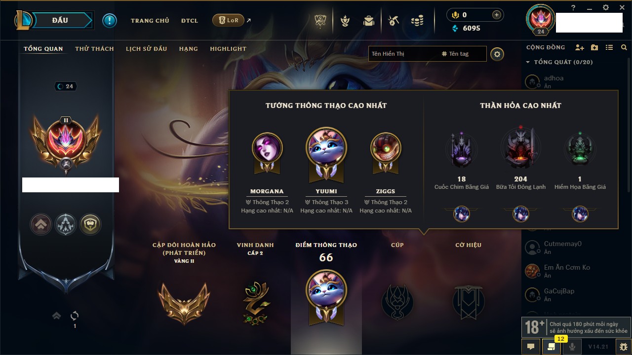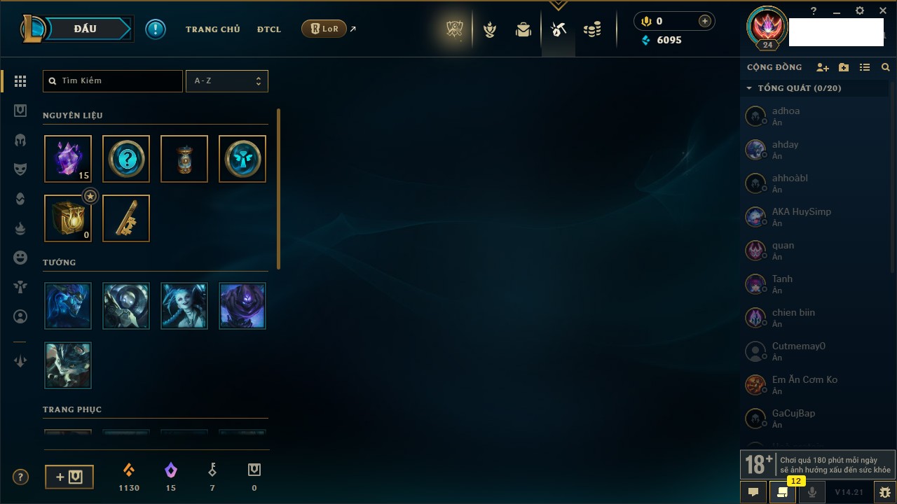 Rank Đơn: Chưa rank mùa nàoKhung: Chưa có khungTướng: 25 - Còn 3210 THXTrang Phục: 2Rank ĐTCL: Chưa RankLinh Thú: 43