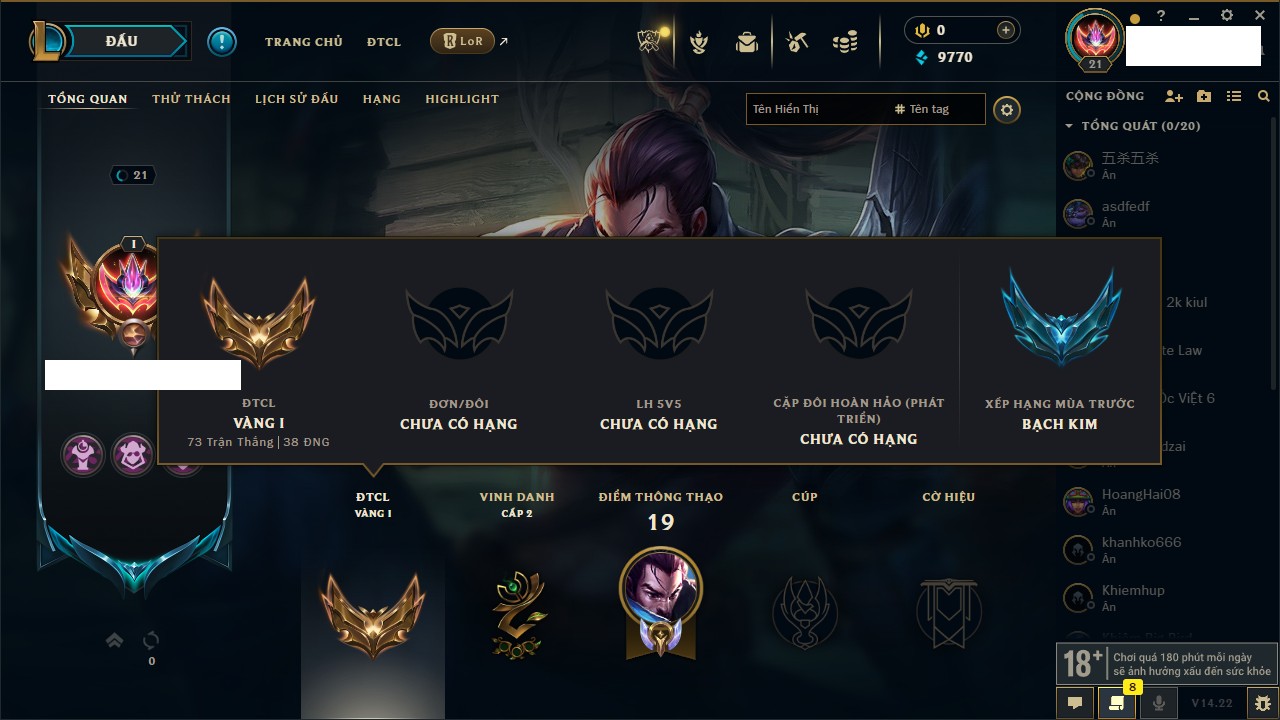 Rank Đơn: Chưa rank mùa nàoKhung: Chưa có khungTướng: 38 - Còn 6280 THXTrang Phục: 2Rank ĐTCL: Chưa RankLinh Thú: 50