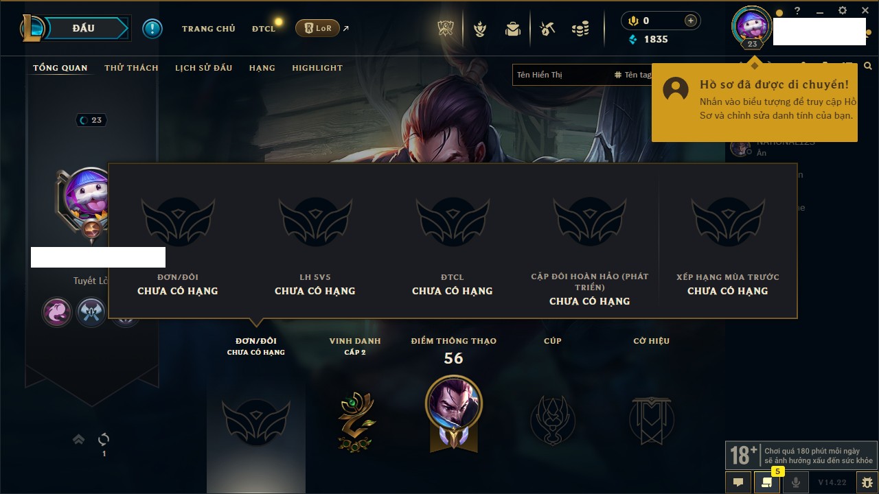 Rank Đơn: Chưa rank mùa nàoKhung: Chưa có khungTướng: 19 - Còn 1155 THXTrang Phục: 2Rank ĐTCL: Chưa RankLinh Thú: 20