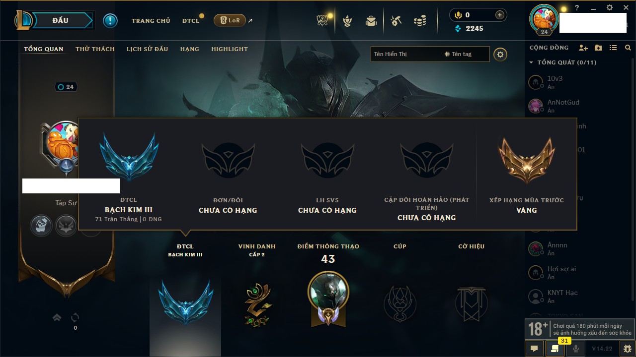 Rank Đơn: Chưa rank mùa nàoKhung: Chưa có khungTướng: 23 - Còn 2245 THXTrang Phục: 2Rank ĐTCL: Chưa RankLinh Thú: 28