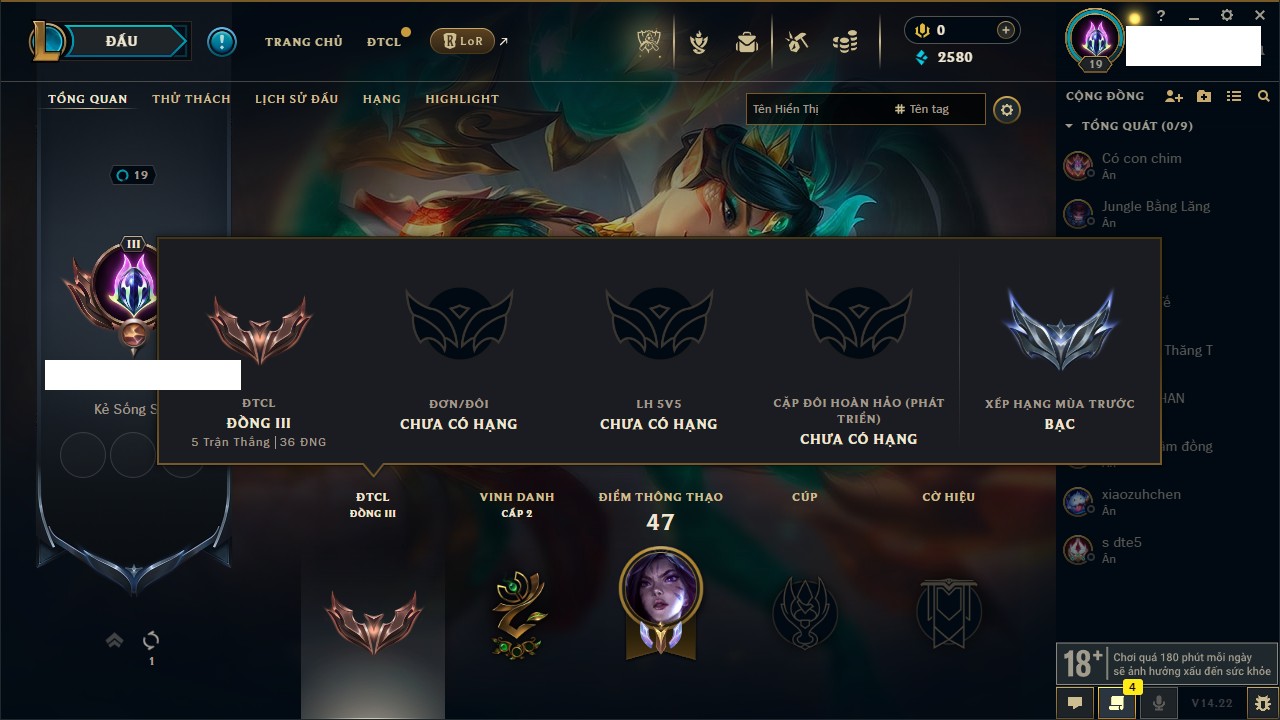 Rank Đơn: Chưa rank mùa nàoKhung: Chưa có khungTướng: 22 - Còn 2580 THXTrang Phục: 1Rank ĐTCL: Chưa RankLinh Thú: 18