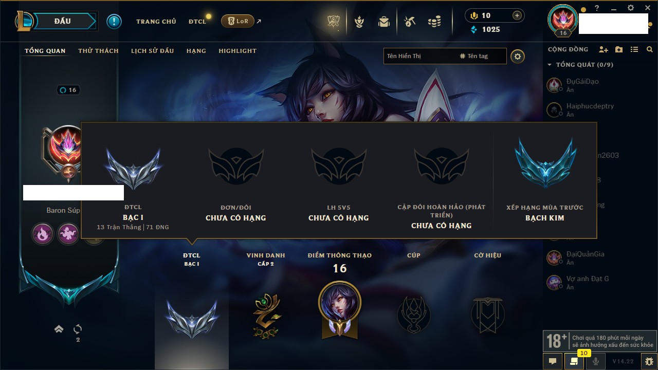 Rank Đơn: Chưa rank mùa nàoKhung: Chưa có khungTướng: 16 - Còn 4325 THXTrang Phục: 2Rank ĐTCL: Chưa RankLinh Thú: 11