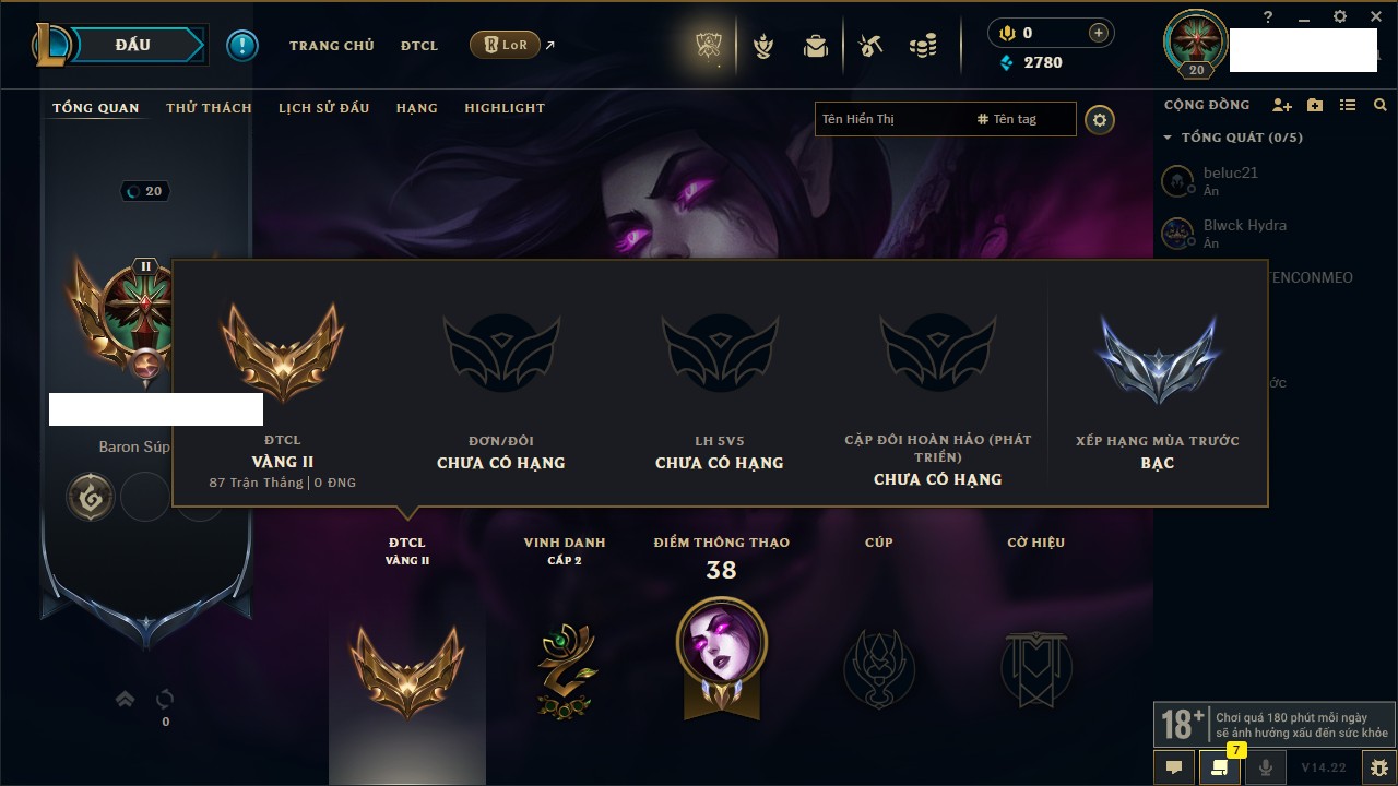 Rank Đơn: Chưa rank mùa nàoKhung: Chưa có khungTướng: 15 - Còn 3080 THXTrang Phục: 2Rank ĐTCL: Chưa RankLinh Thú: 40