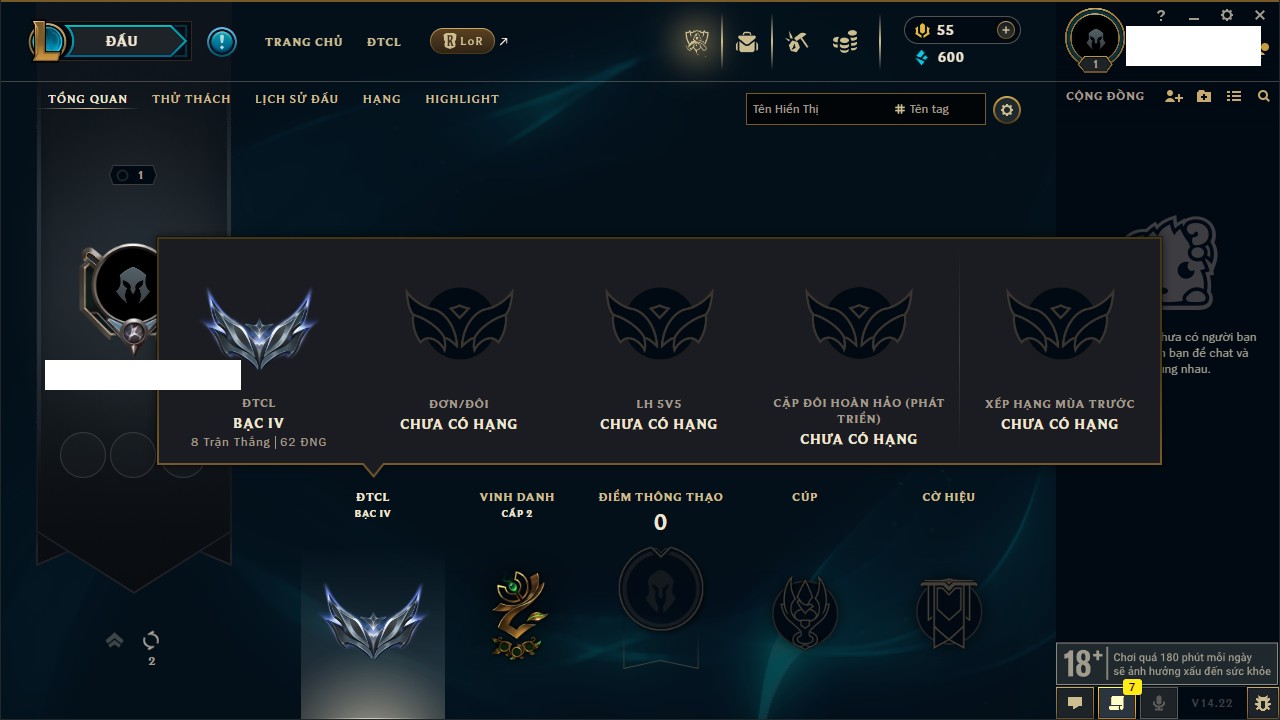 Rank Đơn: Chưa rank mùa nàoKhung: Chưa có khungTướng: 0 - Còn 600 THXTrang Phục: 0Rank ĐTCL: Chưa RankLinh Thú: 5