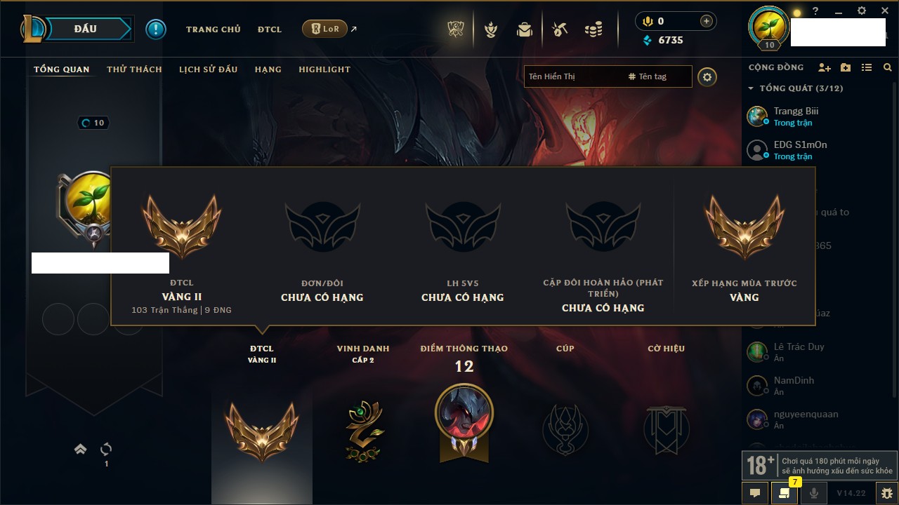 Rank Đơn: Chưa rank mùa nàoKhung: Chưa có khungTướng: 4 - Còn 12000 THXTrang Phục: 0Rank ĐTCL: Bạch Kim IIILinh Thú: 20