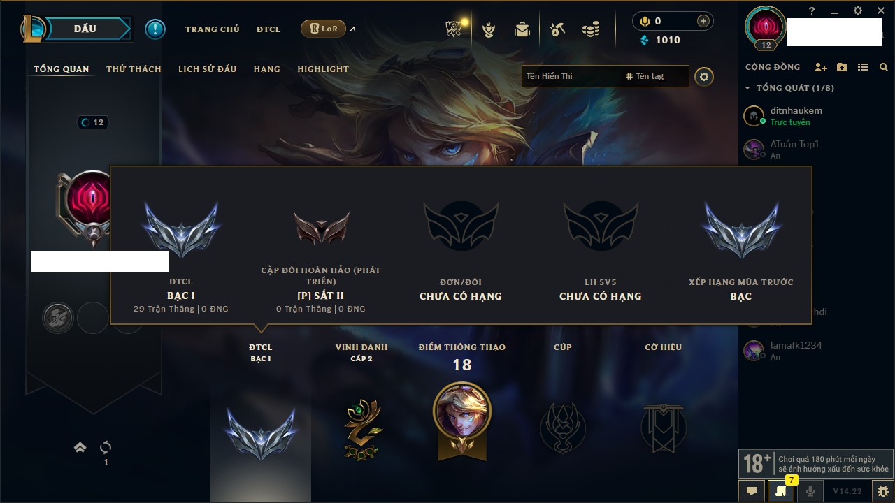 Rank Đơn: Chưa rank mùa nàoKhung: Chưa có khungTướng: 10 - Còn 21800 THXTrang Phục: 0Rank ĐTCL: Bạc ILinh Thú: 33