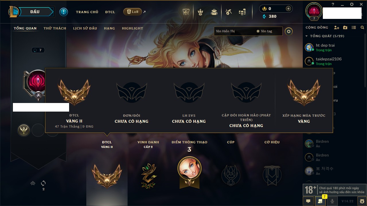 Rank Đơn: Chưa rank mùa nàoKhung: Chưa có khungTướng: 2 - Còn 9000 THXTrang Phục: 0Rank ĐTCL: Bạch Kim IIILinh Thú: 31