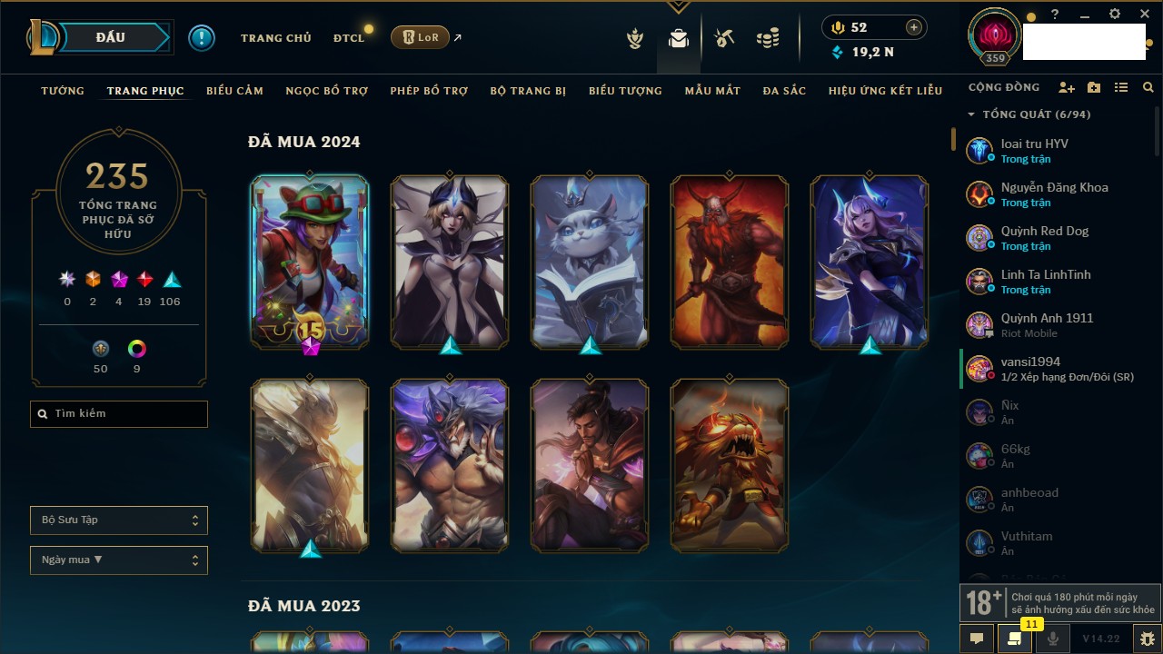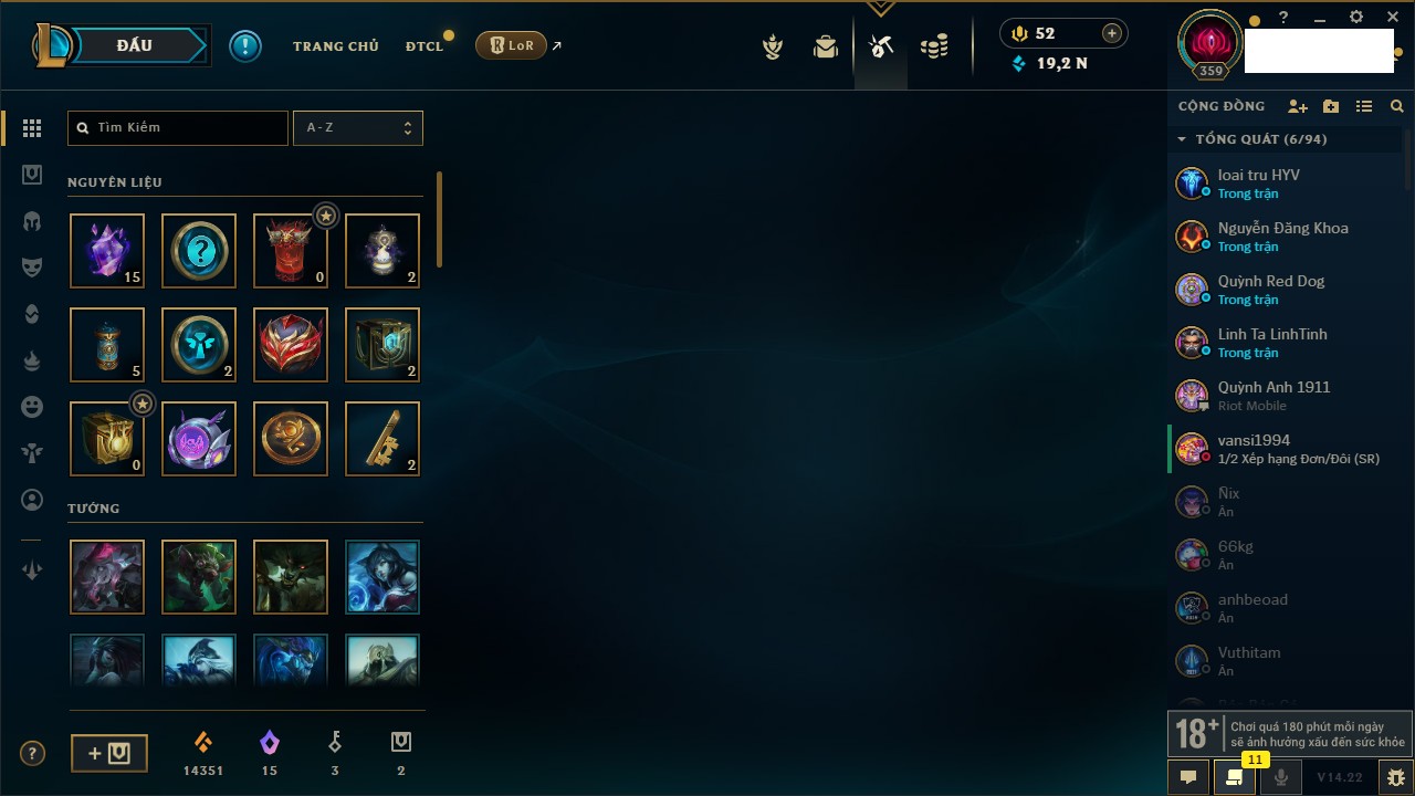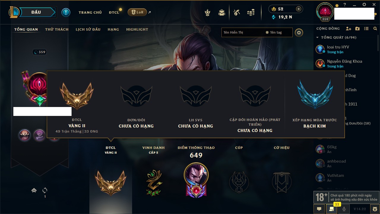 Rank Đơn: Vàng IKhung: Bạch kimTướng: 170 - Còn 212450 THXTrang Phục: 214Rank ĐTCL: Bạch Kim IVLinh Thú: 221