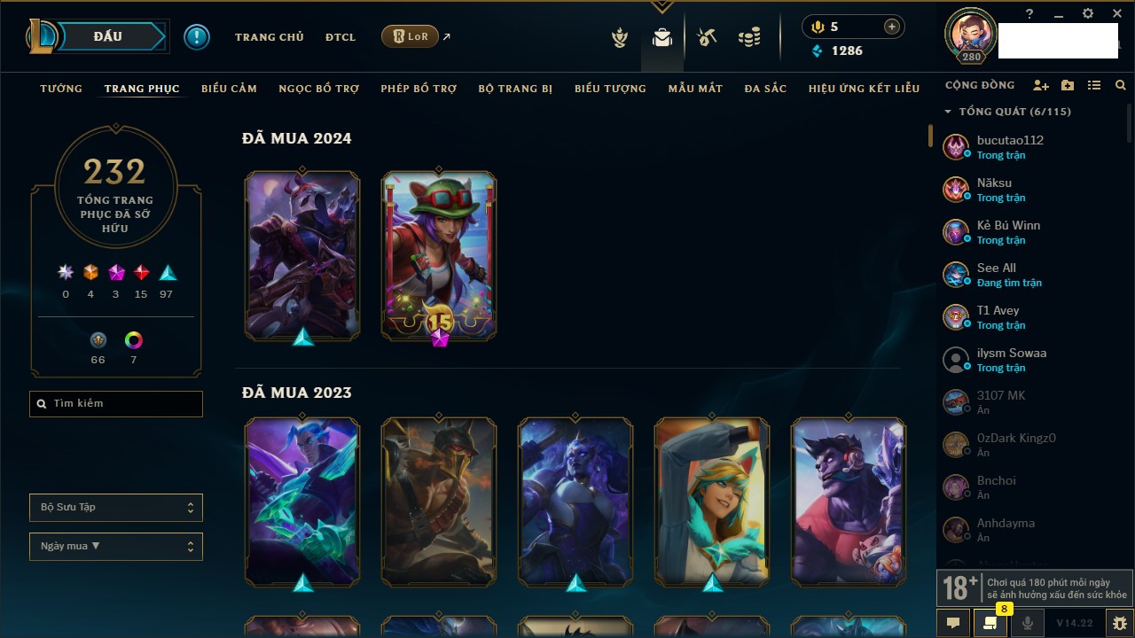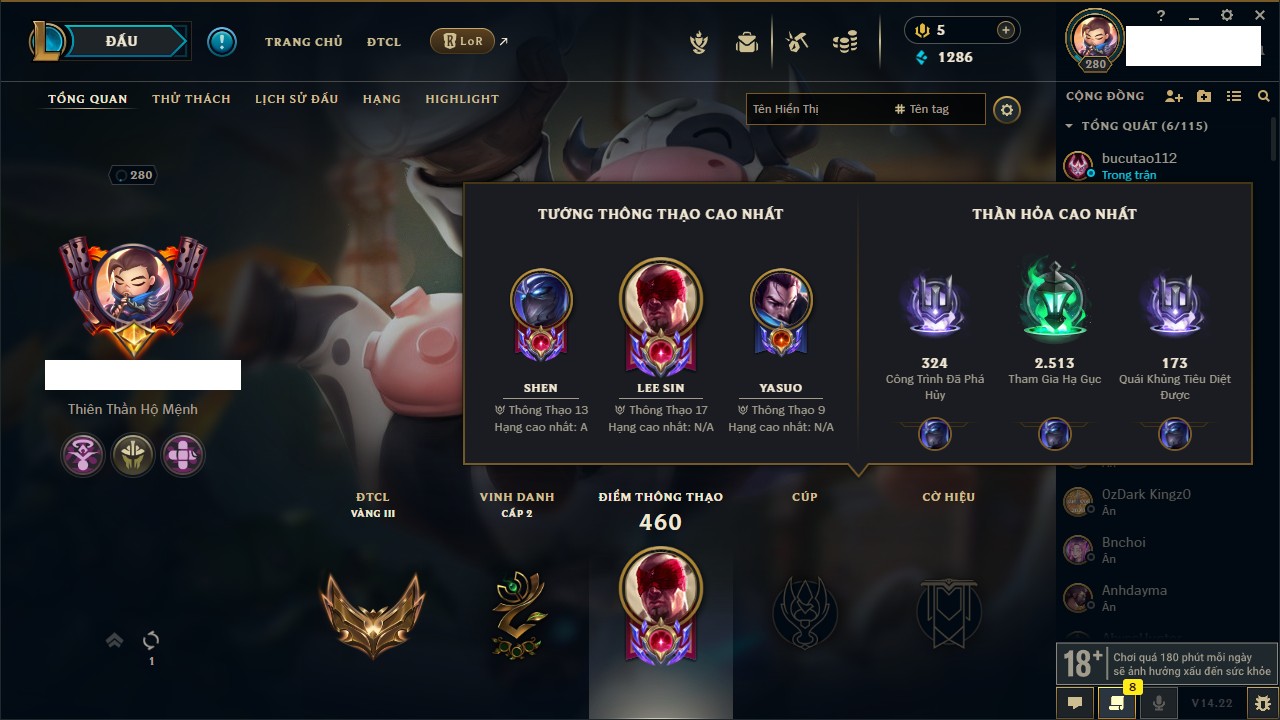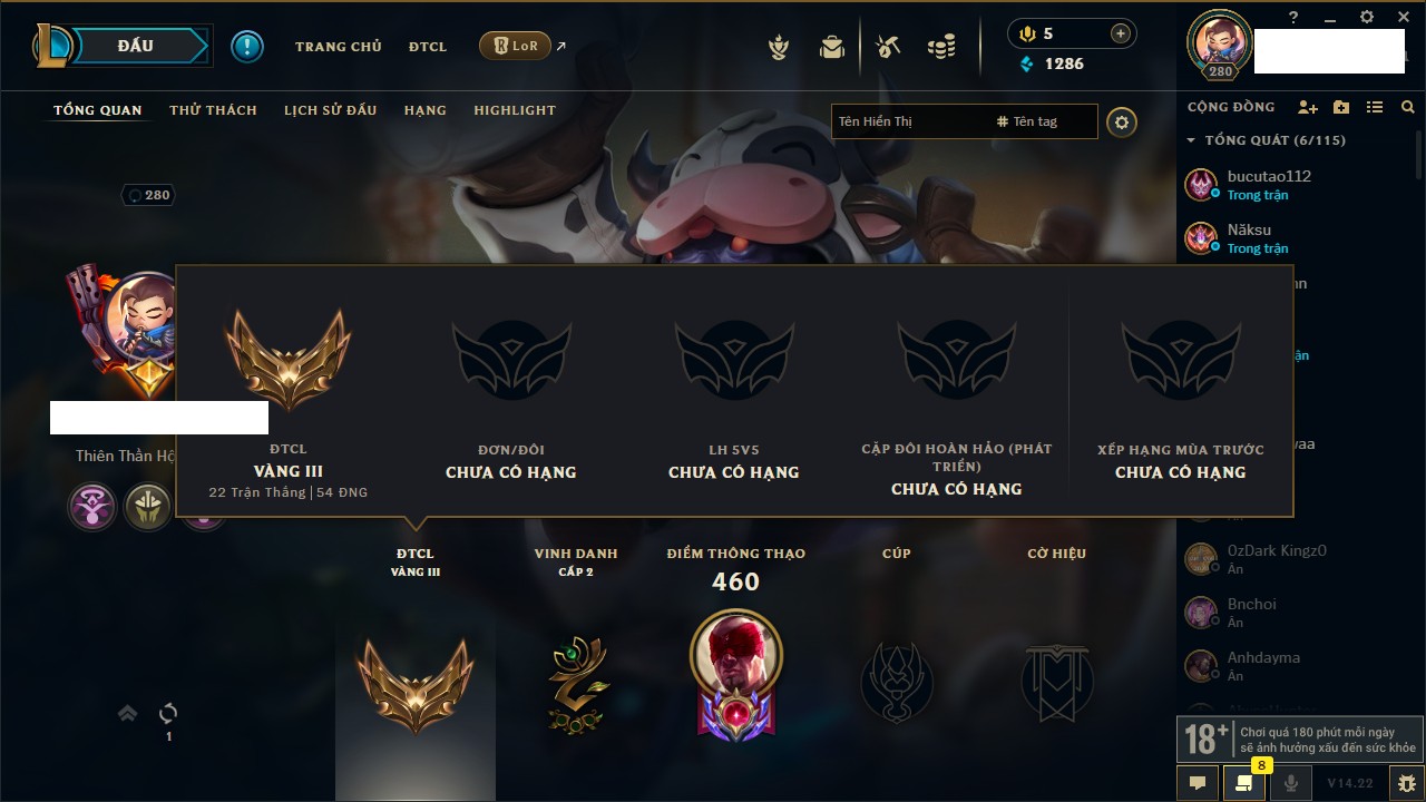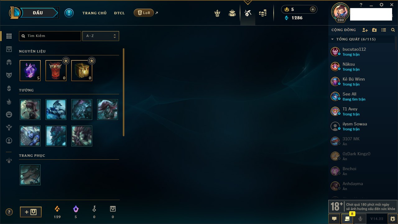Rank Đơn: Bạc IIIKhung: BạcTướng: 171 - Còn 51045 THXTrang Phục: 220Rank ĐTCL: Sắt IILinh Thú: 141