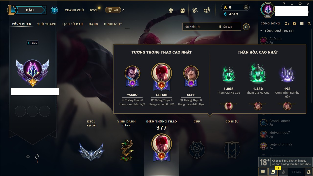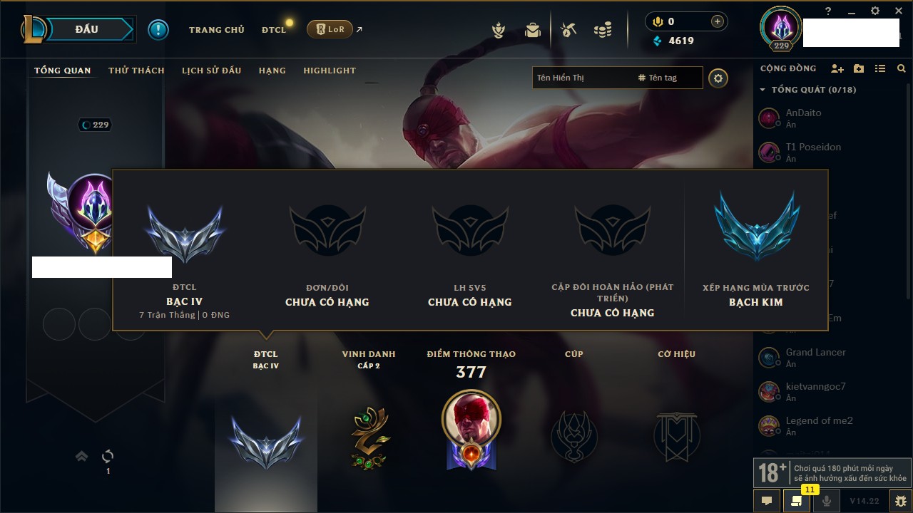 Rank Đơn: Vàng IVKhung: VàngTướng: 146 - Còn 89110 THXTrang Phục: 63Rank ĐTCL: Vàng IIILinh Thú: 41