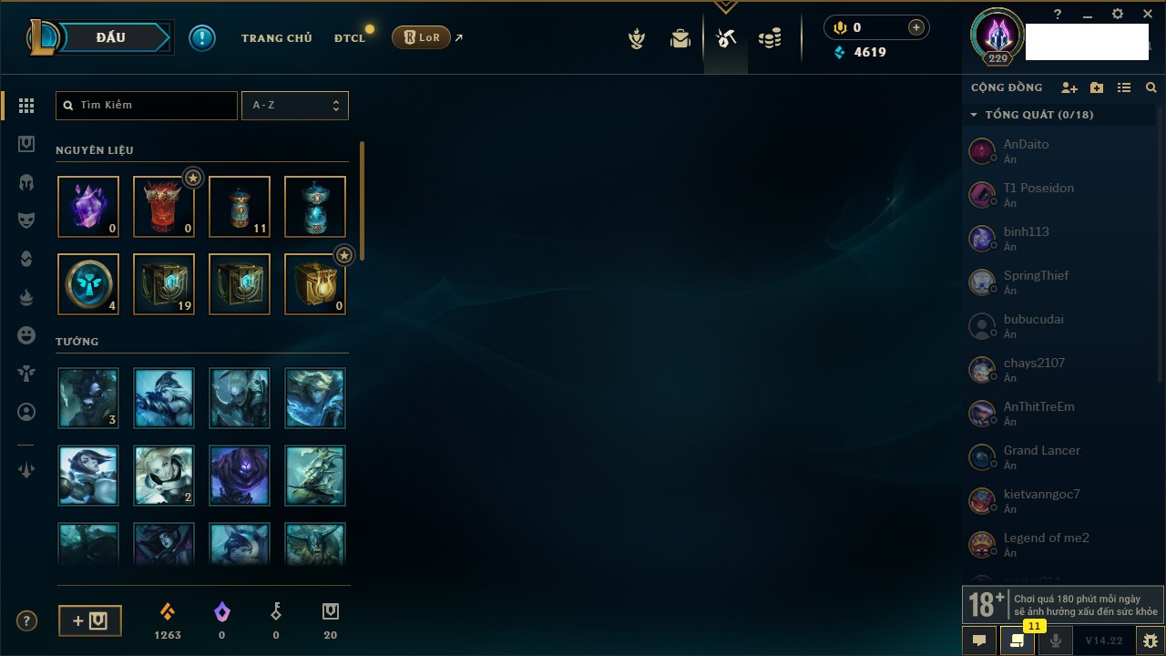 Rank Đơn: Đồng IIKhung: Chưa có khungTướng: 170 - Còn 56487 THXTrang Phục: 90Rank ĐTCL: Chưa RankLinh Thú: 129