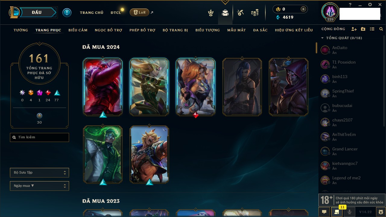 Rank Đơn: Vàng IIIKhung: VàngTướng: 170 - Còn 33222 THXTrang Phục: 136Rank ĐTCL: Chưa RankLinh Thú: 40