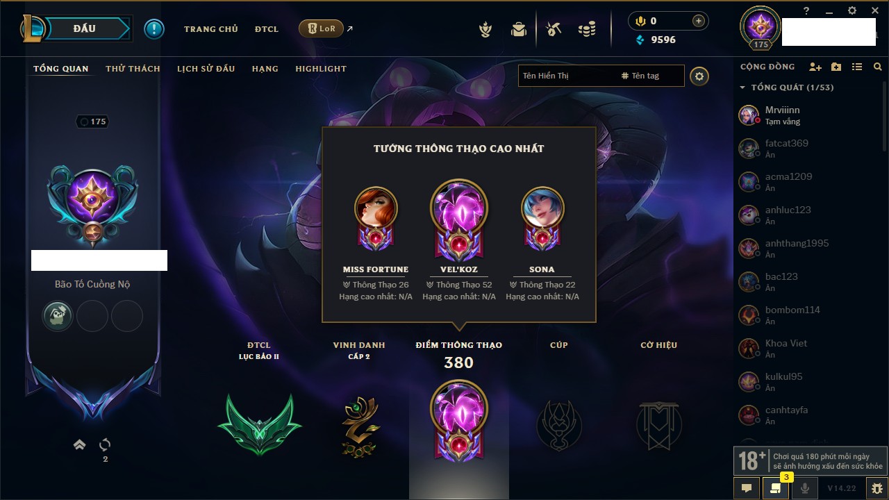Rank Đơn: Chưa rank mùa nàoKhung: Chưa có khungTướng: 12 - Còn 3853 THXTrang Phục: 2Rank ĐTCL: Chưa RankLinh Thú: 30