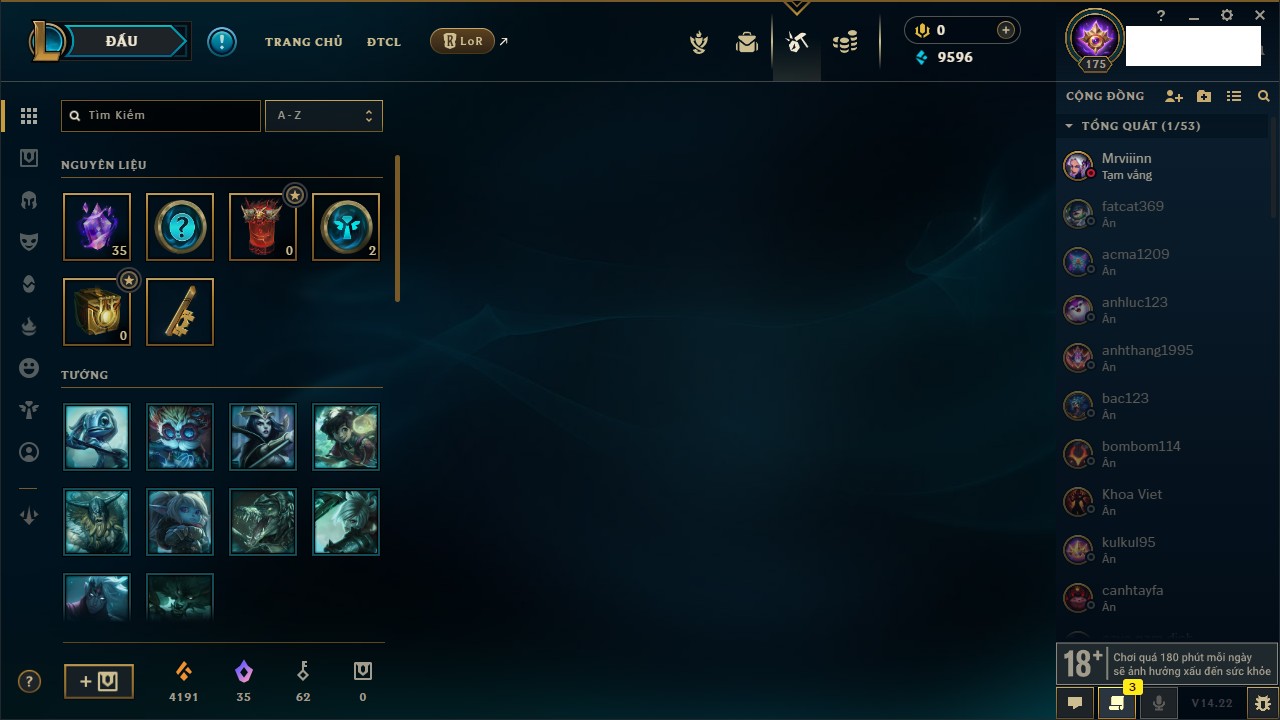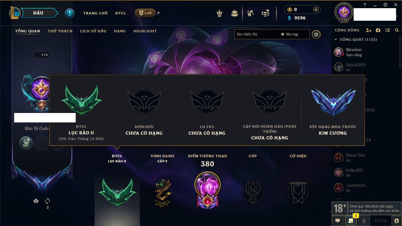 Rank Đơn: Chưa rank mùa nàoKhung: Chưa có khungTướng: 2 - Còn 9000 THXTrang Phục: 0Rank ĐTCL: Bạch Kim IIILinh Thú: 31