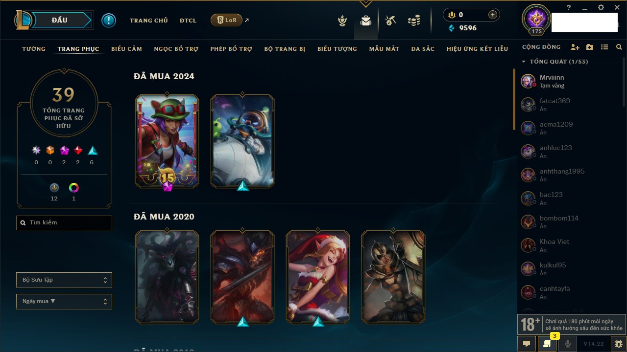 Rank Đơn: Chưa rank mùa nàoKhung: Chưa có khungTướng: 12 - Còn 430 THXTrang Phục: 1Rank ĐTCL: Chưa RankLinh Thú: 1