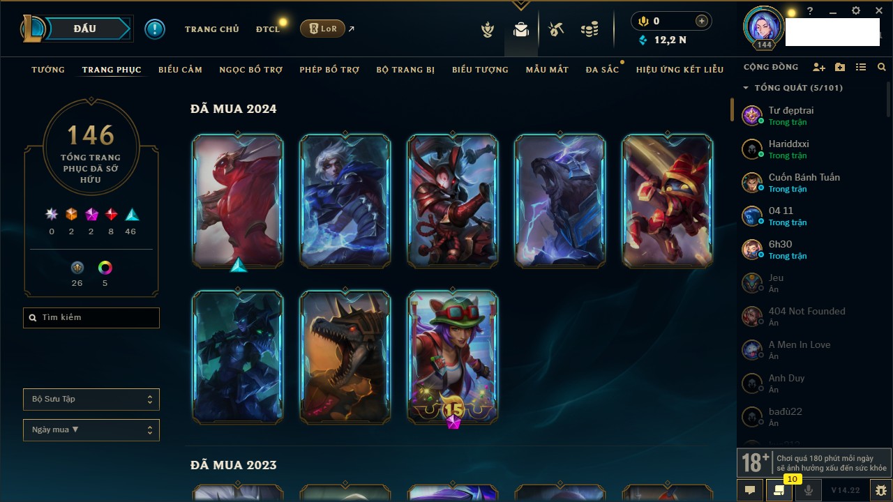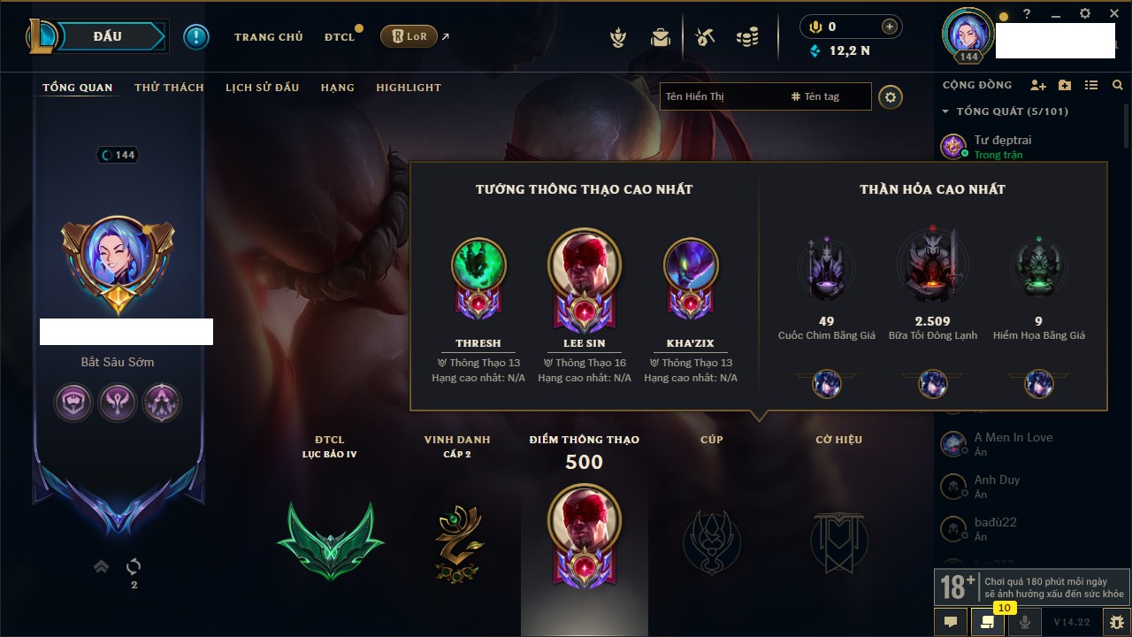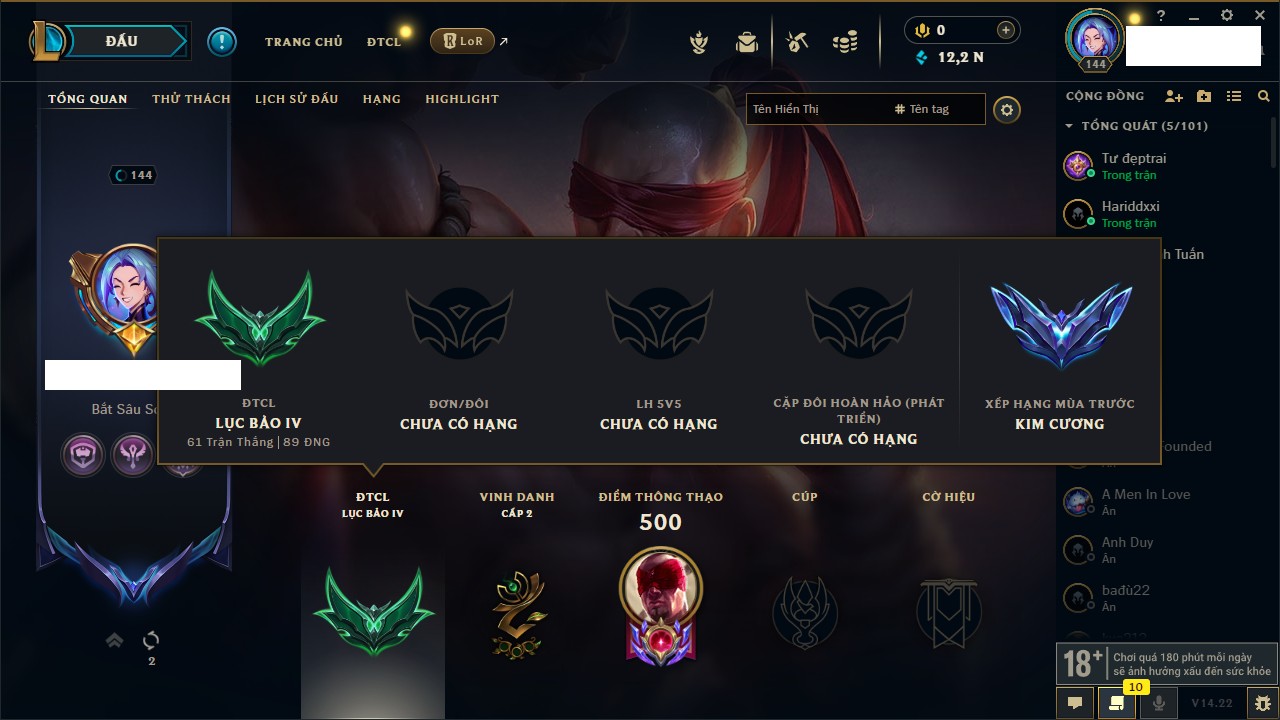 Rank Đơn: Chưa RankKhung: Chưa có khungTướng: 165 - Còn 3214 THXTrang Phục: 160Rank ĐTCL: Chưa RankLinh Thú: 28