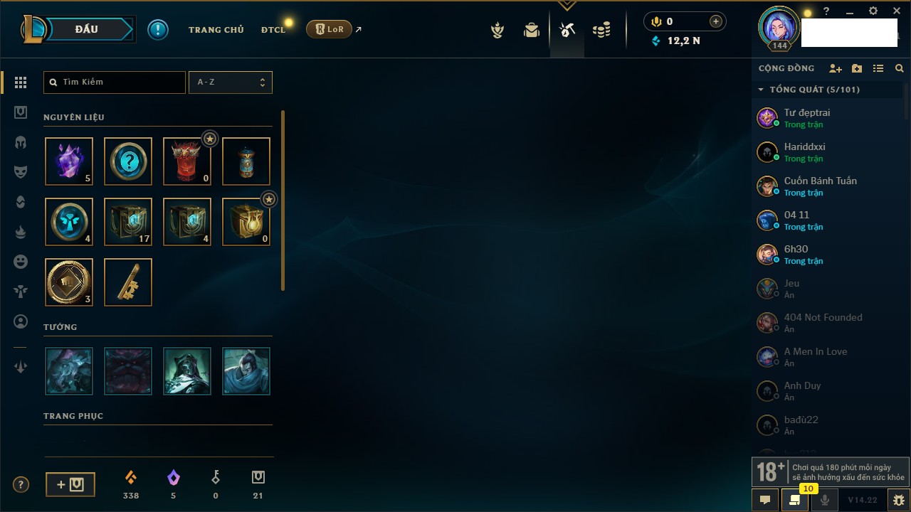 Rank Đơn: Chưa RankKhung: Chưa có khungTướng: 37 - Còn 27387 THXTrang Phục: 10Rank ĐTCL: Chưa RankLinh Thú: 1