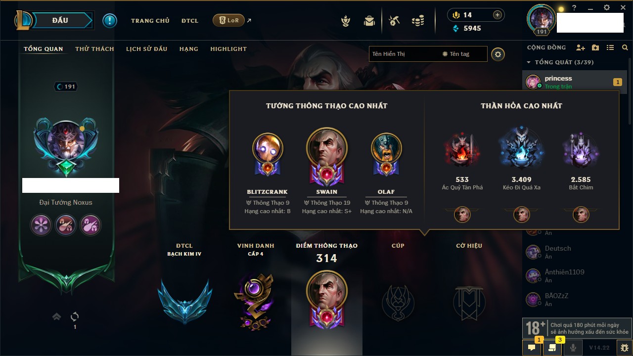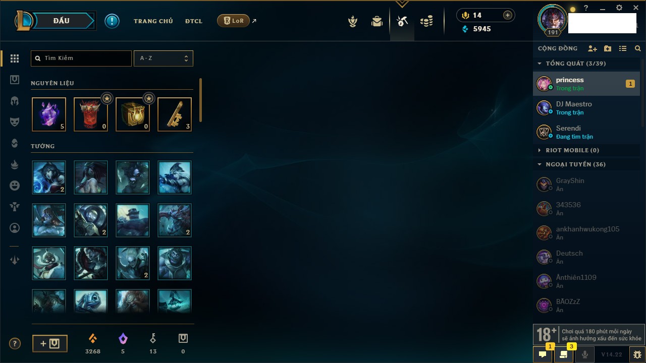 Rank Đơn: Vàng IIIKhung: BạcTướng: 171 - Còn 101359 THXTrang Phục: 88Rank ĐTCL: Kim Cương IVLinh Thú: 200