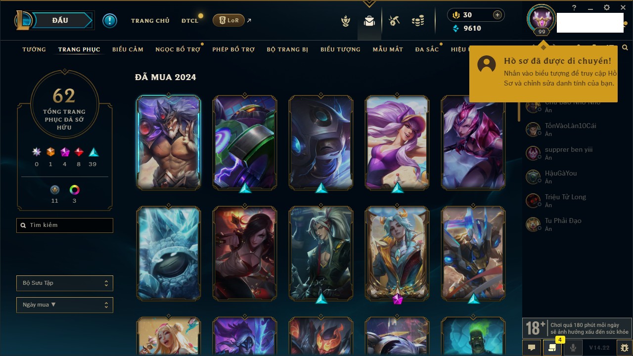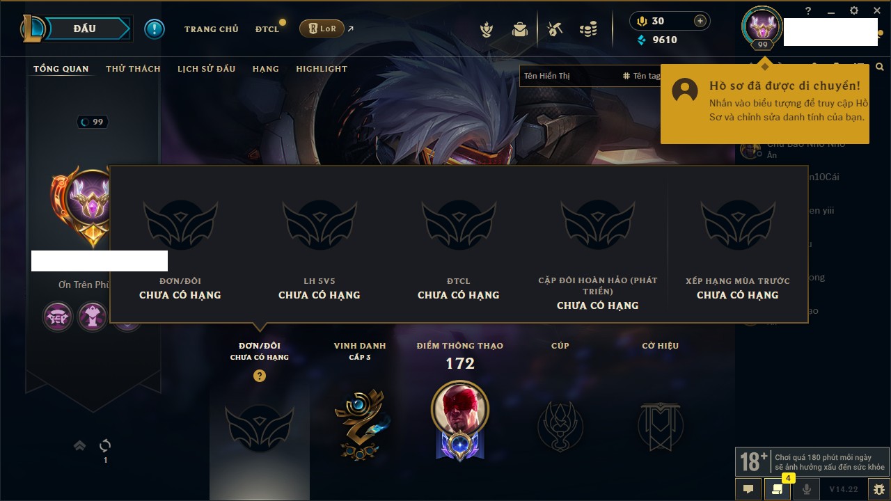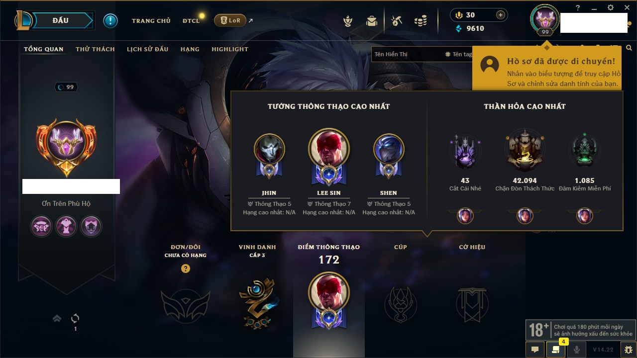Rank Đơn: Vàng IIIKhung: BạcTướng: 171 - Còn 101359 THXTrang Phục: 88Rank ĐTCL: Kim Cương IVLinh Thú: 200