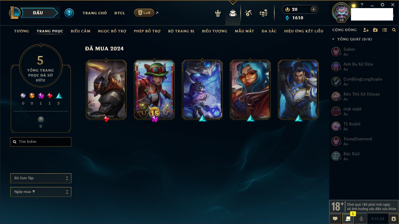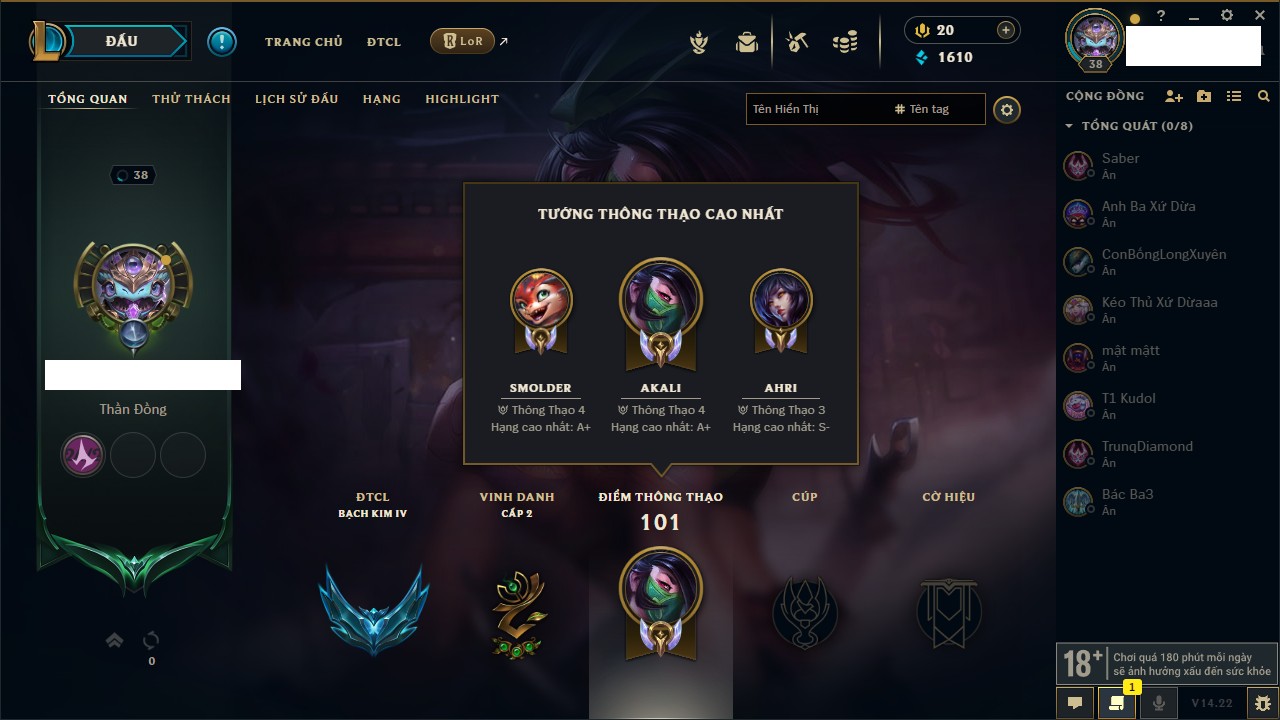 Rank Đơn: Bạch Kim IIKhung: Bạch kimTướng: 171 - Còn 315217 THXTrang Phục: 238Rank ĐTCL: Bạch Kim ILinh Thú: 116