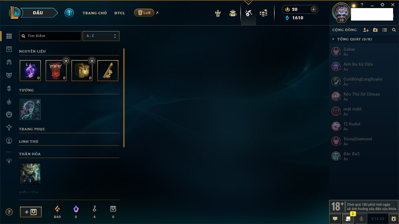 Rank Đơn: Bạc IIIKhung: BạcTướng: 171 - Còn 190352 THXTrang Phục: 260Rank ĐTCL: Sắt IILinh Thú: 31