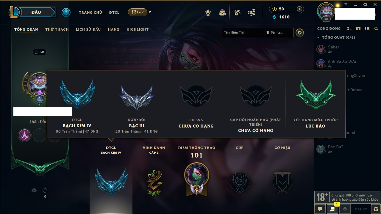 Rank Đơn: Lục Bảo IVKhung: VàngTướng: 171 - Còn 154648 THXTrang Phục: 203Rank ĐTCL: Bạch Kim IVLinh Thú: 69