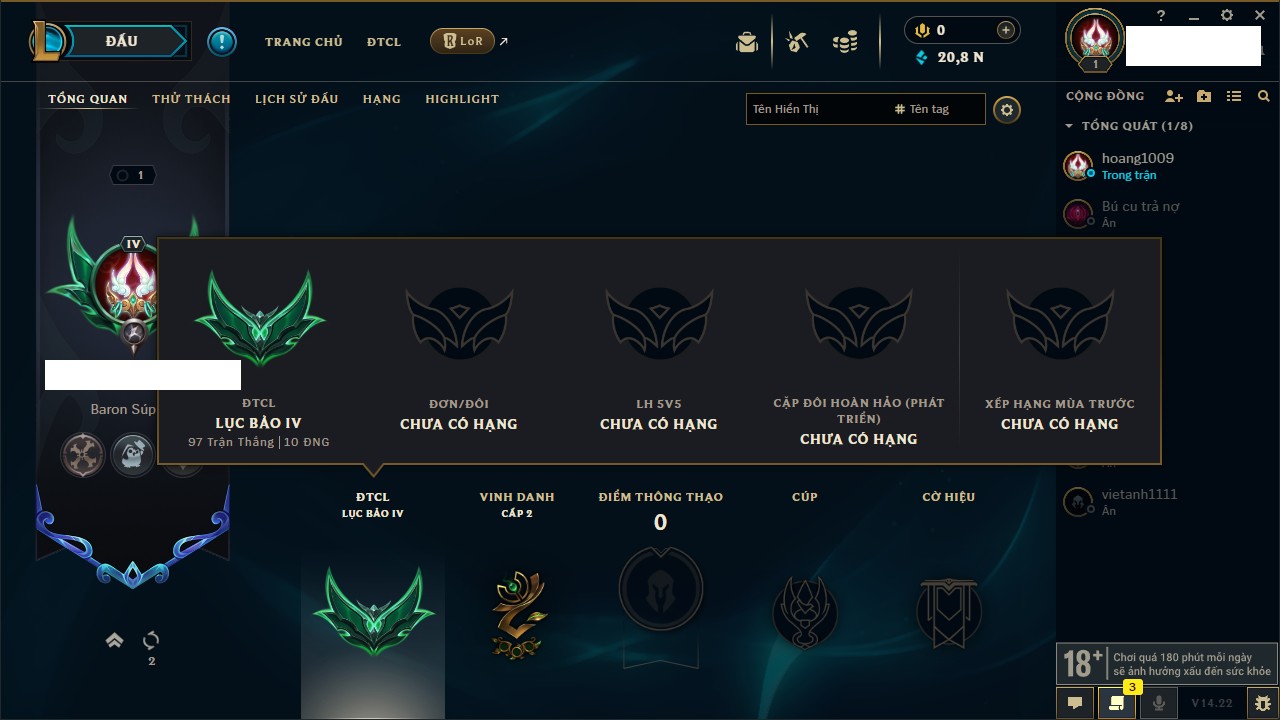 Rank Đơn: Chưa RankKhung: Chưa có khungTướng: 29 - Còn 54 THXTrang Phục: 0Rank ĐTCL: Chưa RankLinh Thú: 1