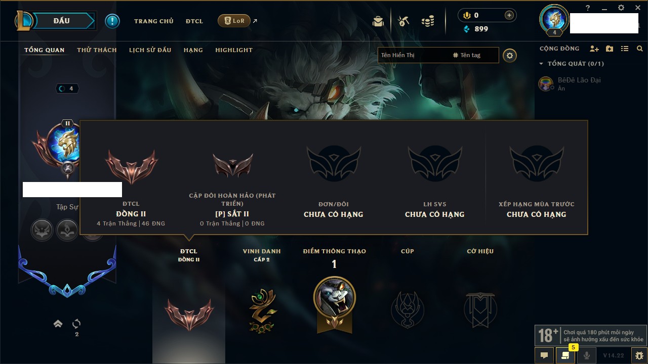 Rank Đơn: Chưa rank mùa nàoKhung: Chưa có khungTướng: 0 - Còn 4000 THXTrang Phục: 0Rank ĐTCL: Đồng ILinh Thú: 18