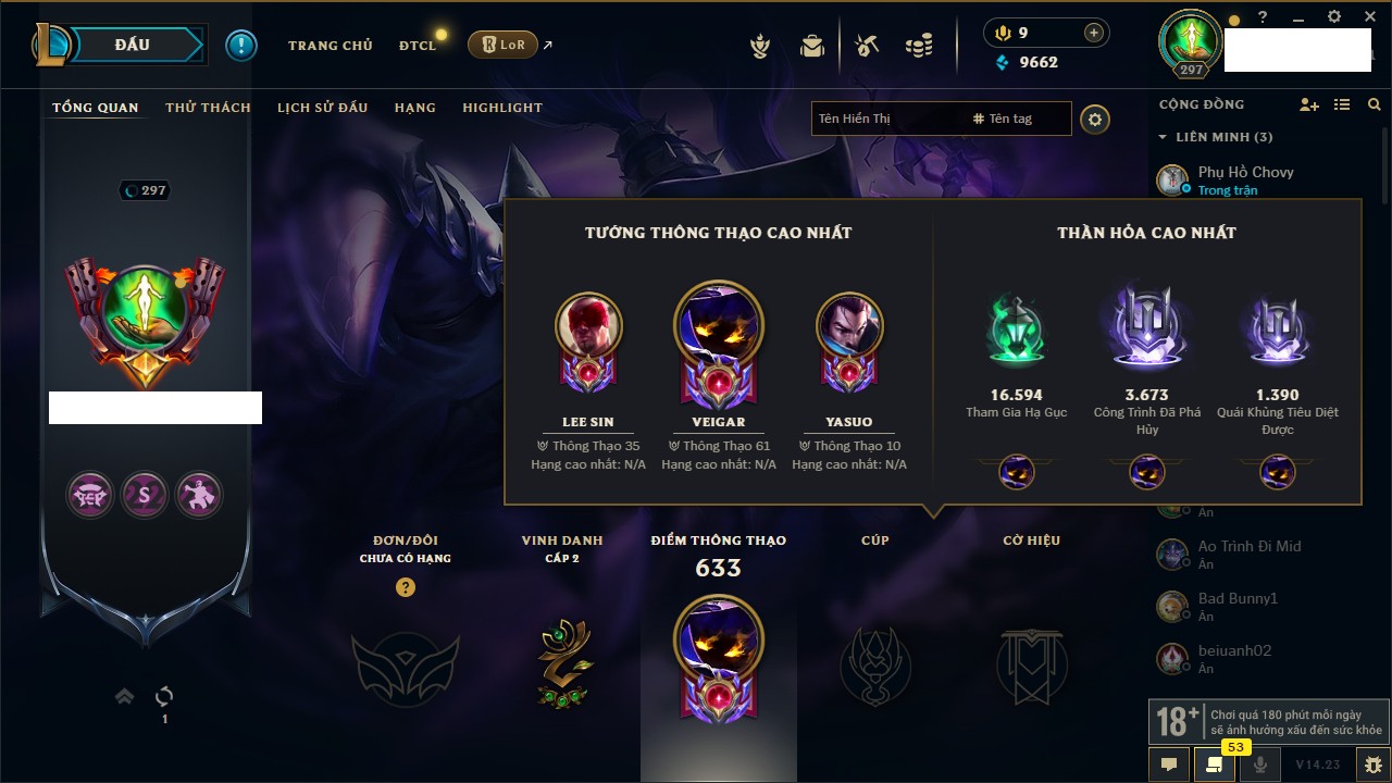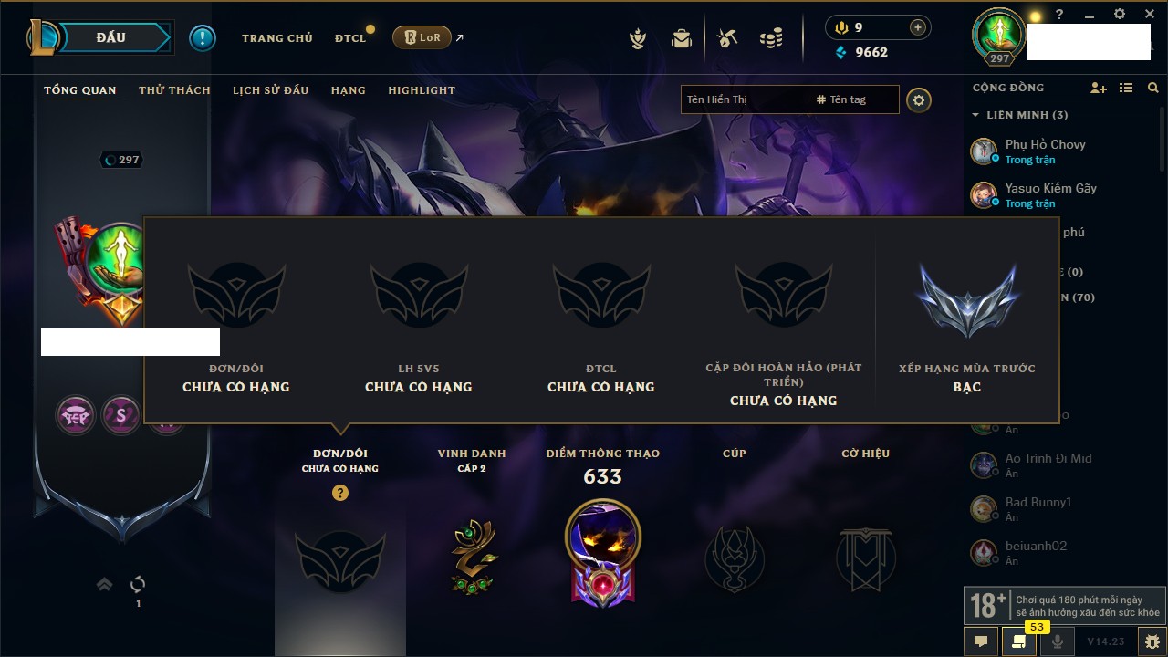 Rank Đơn: Vàng IKhung: BạcTướng: 171 - Còn 60584 THXTrang Phục: 286Rank ĐTCL: Vàng IIILinh Thú: 117