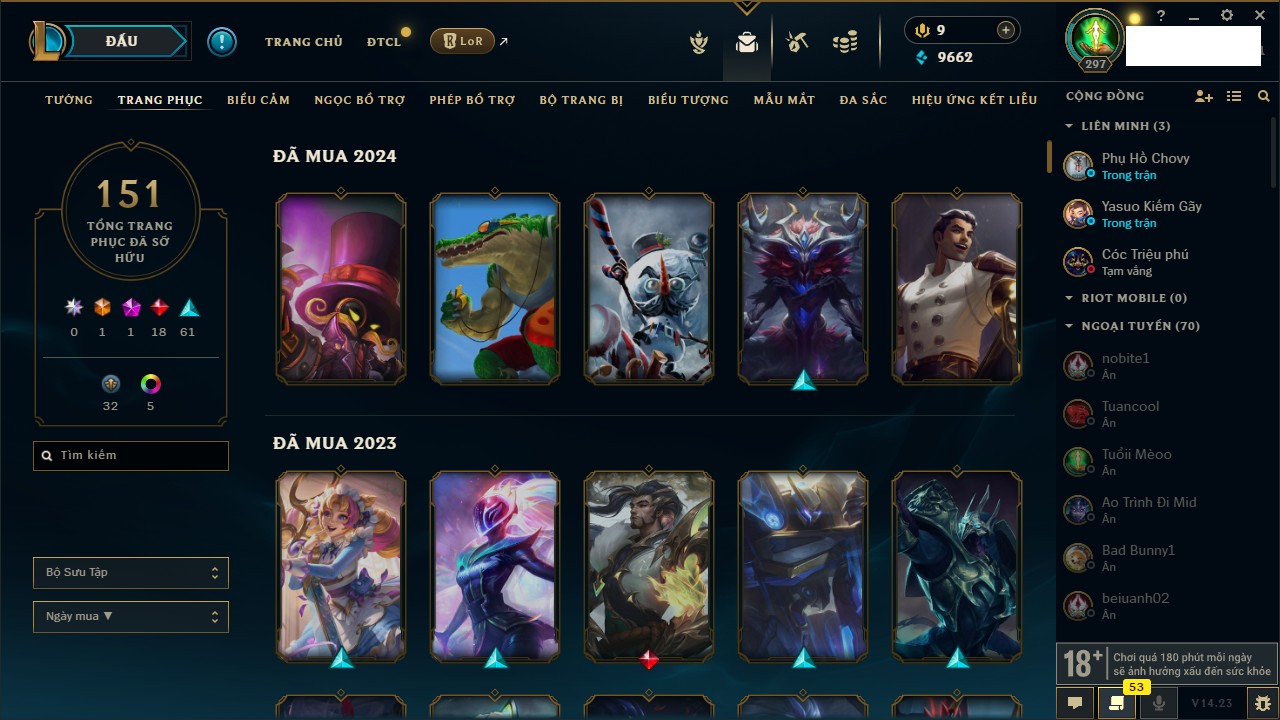 Rank Đơn: Vàng IIIKhung: VàngTướng: 171 - Còn 88128 THXTrang Phục: 329Rank ĐTCL: Chưa RankLinh Thú: 41