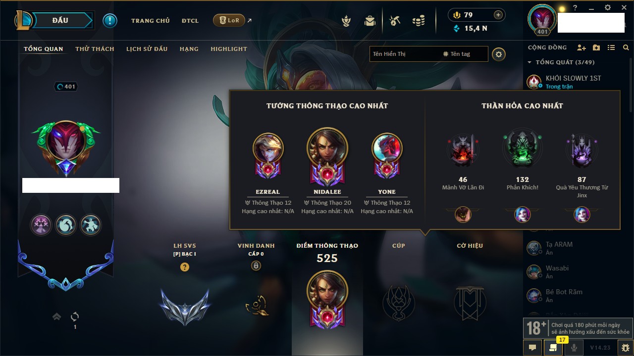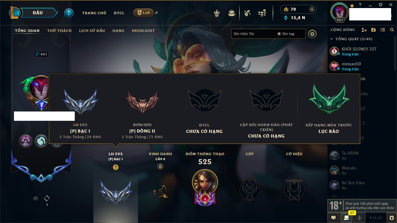 Rank Đơn: Bạch Kim IIIKhung: Bạch kimTướng: 171 - Còn 136108 THXTrang Phục: 261Rank ĐTCL: Bạc IVLinh Thú: 73