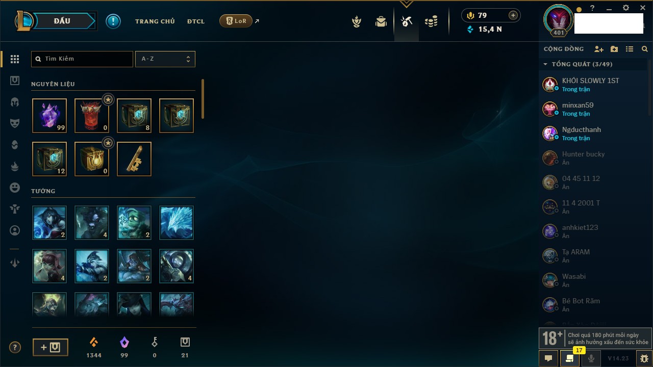 Rank Đơn: Bạch Kim IIKhung: Bạch kimTướng: 171 - Còn 315217 THXTrang Phục: 238Rank ĐTCL: Bạch Kim ILinh Thú: 116