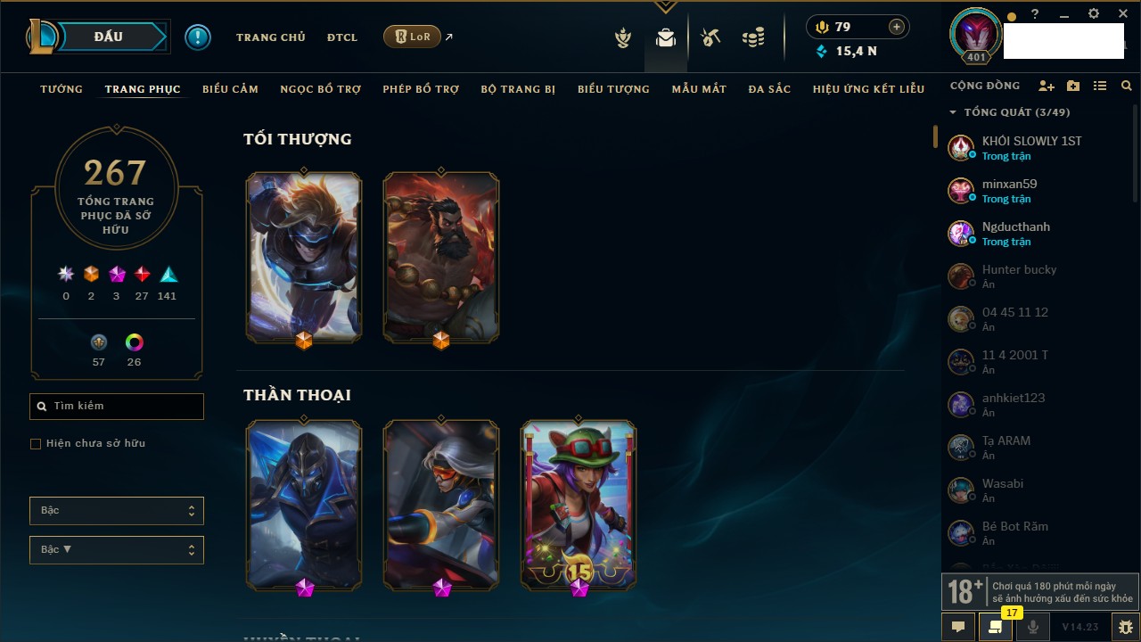 Rank Đơn: Lục Bảo IVKhung: VàngTướng: 171 - Còn 154648 THXTrang Phục: 203Rank ĐTCL: Bạch Kim IVLinh Thú: 69