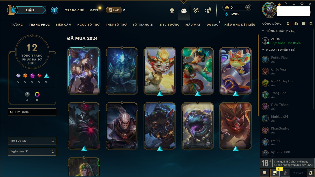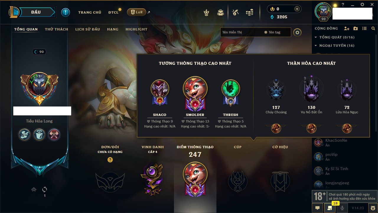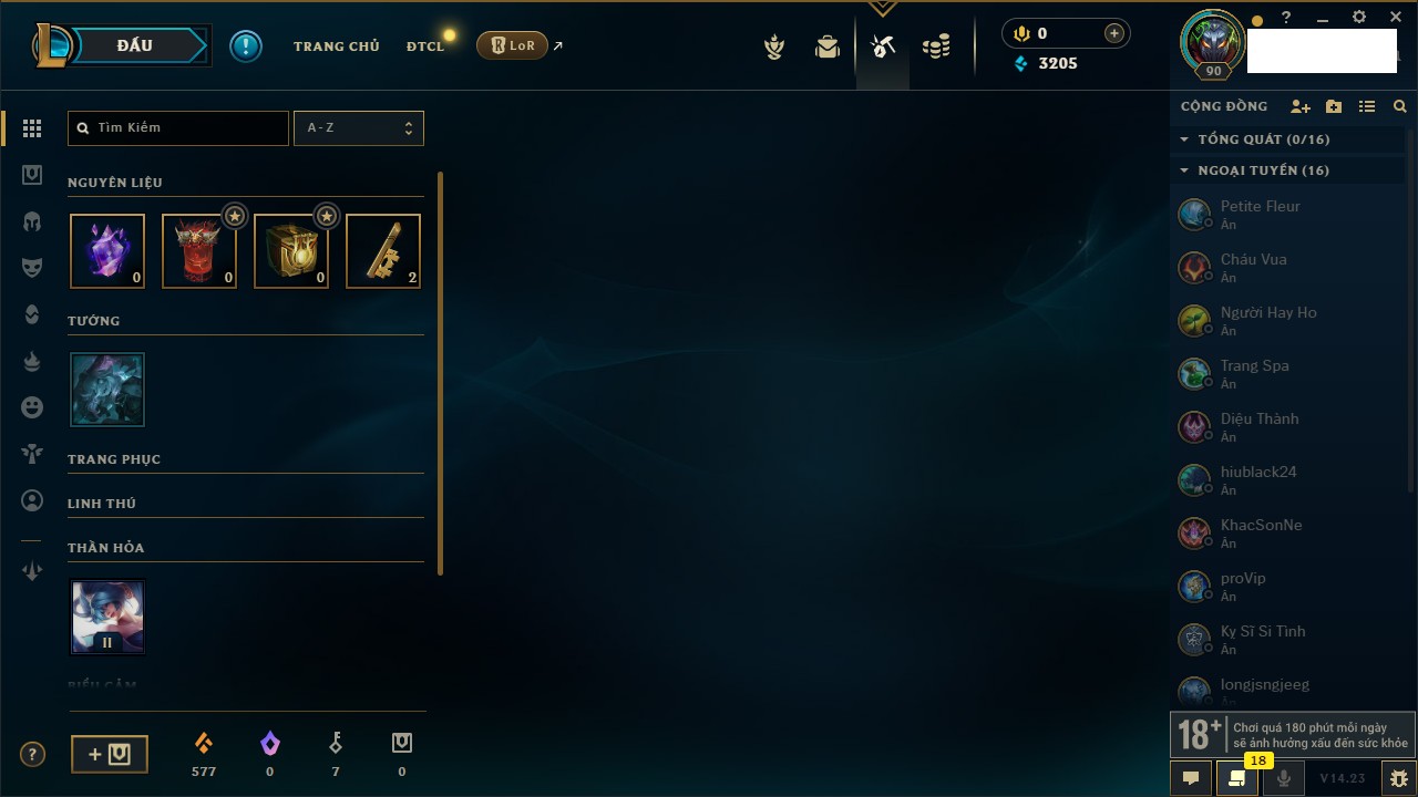 Rank Đơn: Chưa RankKhung: Chưa có khungTướng: 118 - Còn 13712 THXTrang Phục: 117Rank ĐTCL: Chưa RankLinh Thú: 34