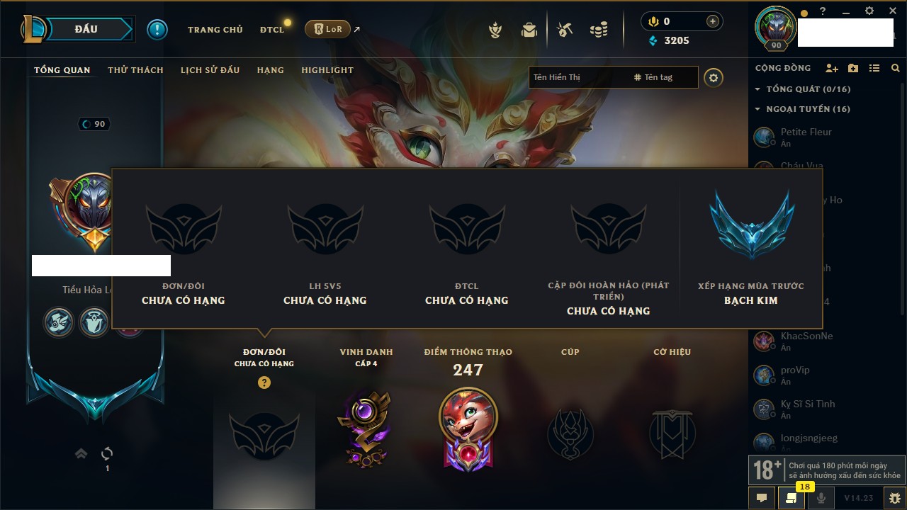 Rank Đơn: Chưa RankKhung: Chưa có khungTướng: 165 - Còn 3214 THXTrang Phục: 160Rank ĐTCL: Chưa RankLinh Thú: 28