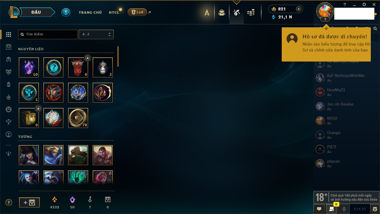 Rank Đơn: Chưa RankKhung: Chưa có khungTướng: 37 - Còn 27387 THXTrang Phục: 10Rank ĐTCL: Chưa RankLinh Thú: 1