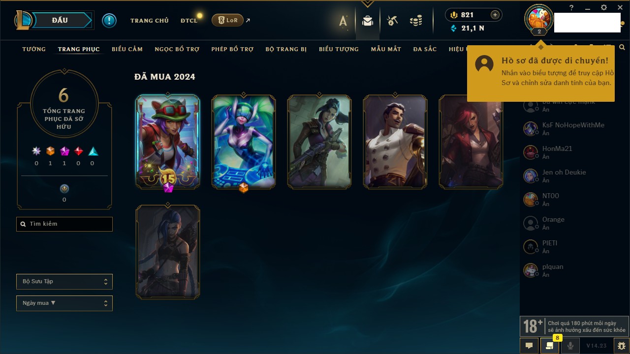 Rank Đơn: Chưa RankKhung: Chưa có khungTướng: 55 - Còn 6150 THXTrang Phục: 33Rank ĐTCL: Chưa RankLinh Thú: 9
