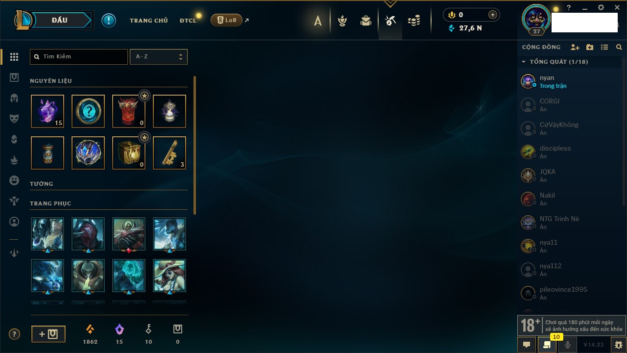 Rank Đơn: Chưa RankKhung: Chưa có khungTướng: 37 - Còn 27387 THXTrang Phục: 10Rank ĐTCL: Chưa RankLinh Thú: 1