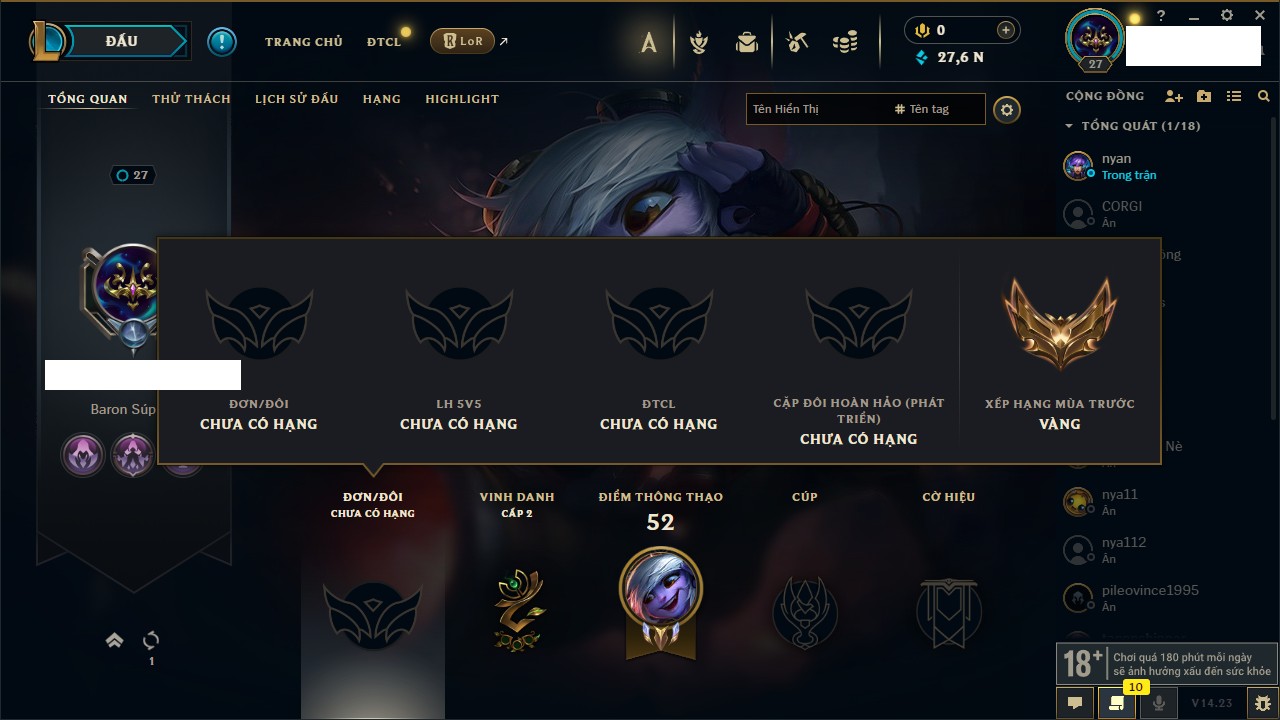 Rank Đơn: Chưa RankKhung: Chưa có khungTướng: 165 - Còn 3214 THXTrang Phục: 160Rank ĐTCL: Chưa RankLinh Thú: 28